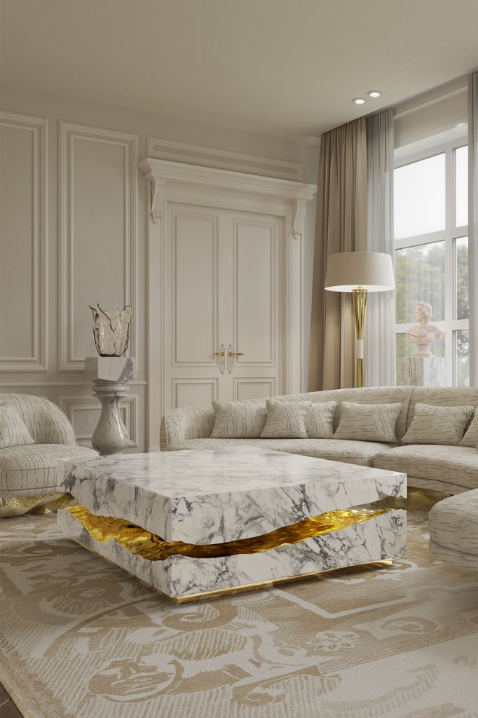 Stolik składa się z dwóch fragmentów wykończonych lustrem i szlachetnym marmurem, a jego piękno podkreślają złote stworzenia, które są gotowe do ostatecznej przemiany.QUARRY CARRARA MARBLE CENTER TABLE