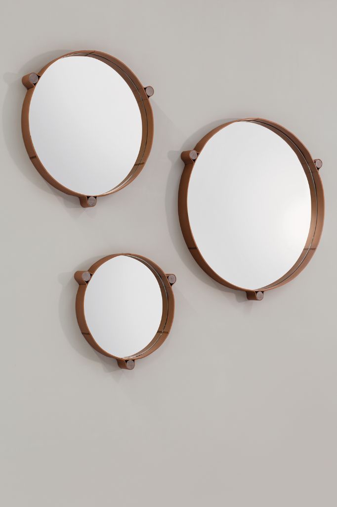 Lustra z konstrukcjami bocznymi z litego bielonego drewna orzechowego Canaletto. Tył z lakierowanej na czarno płyty MDF, z przodu lustro. Metalowa krawędź zewnętrzna pokryta jedną z trzech dostępnych skór: Soffio, Setanil i Natural Velour.