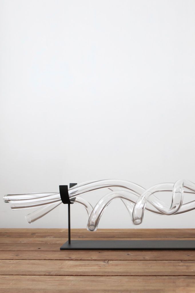 The SkLO Coil 32 Object is a slightly smaller version of the Coil 48. Twisting tubes of handblown glass with cut and polished ends. Coil 32 showcases the inimitable clarity and thickness of Czech glass, embodying the ability of glassblowing to capture the kinetic moment in time.Coil 48