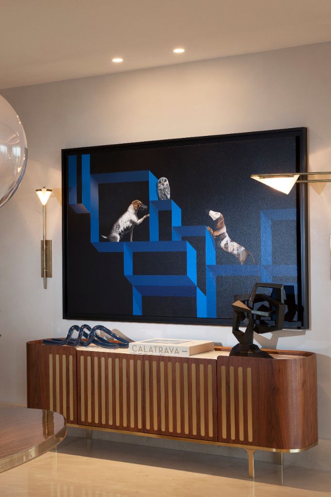 Covered in hand-painted tiles, the sideboard also incorporates the Japanese technique of kintsugi, where the imperfections and cracks in the tiles are highlighted by gold strokes, creating a unique piece that celebrates beauty in the scars of time.