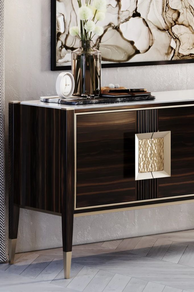 Sideboard in dark-stained wood with marble top and brushed brass details.