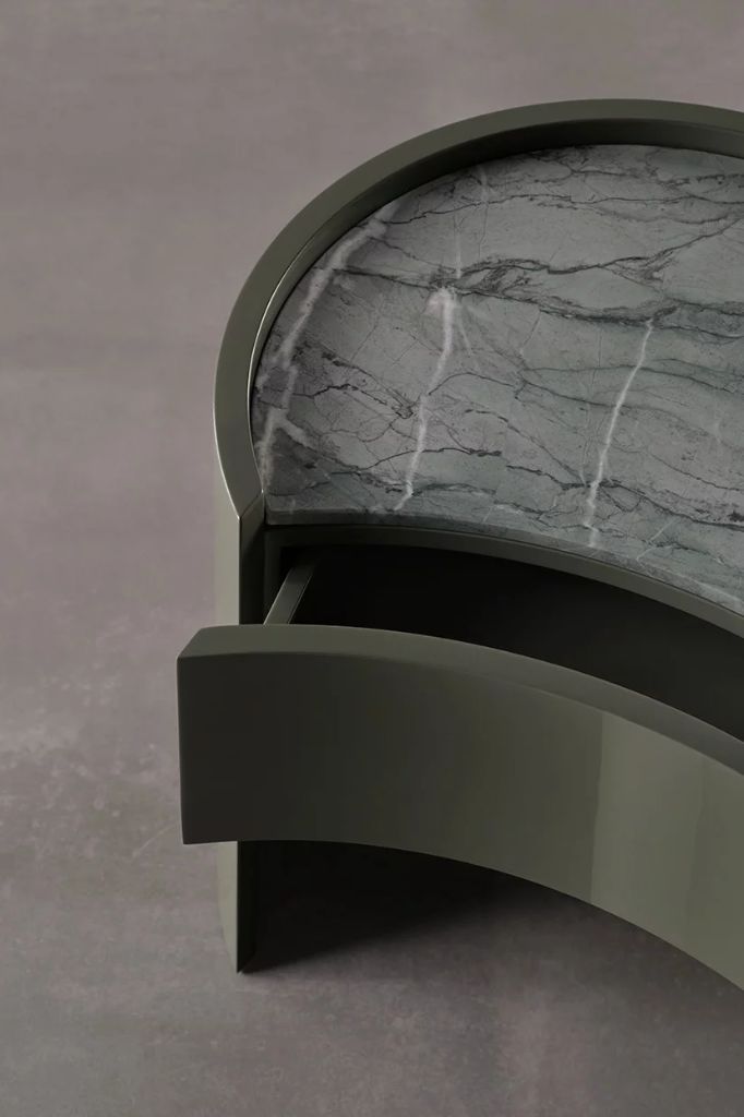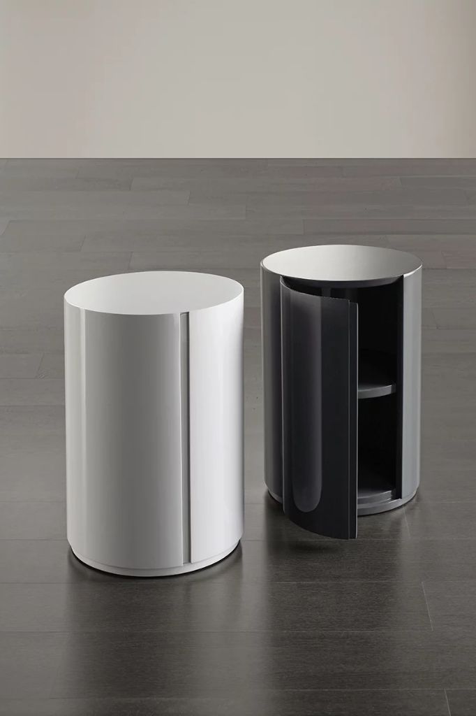 Ronny to cylindryczny stolik nocny dostępny z szufladami lub drzwiami, charakteryzujący się wklęsłym frontem i obniżonym blatem, który może być - podobnie jak rama - pokryty błyszczącym lub matowym lakierem lub wykonany z marmuru.STONE UP