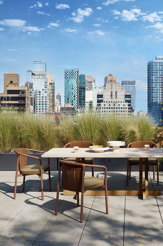 The round table, with a teak structure, offers tops in Pearl concrete, Lava Stone gres, or textured Slate gray glass, combining essential design and refined materials for elegant and functional outdoor spaces.Eleanor Rectangular Dining Table