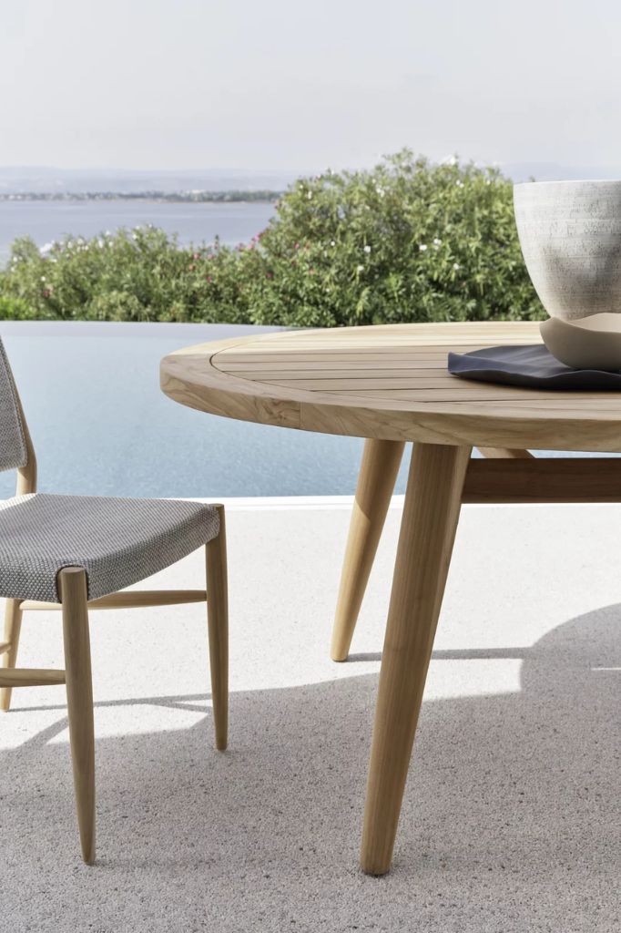 The lounge armchair - made of natural teak - is characterised by horizontal cuts along the back and seat that lighten the aesthetics and soften the shapes. Cushions, removable cover.Eidos round table