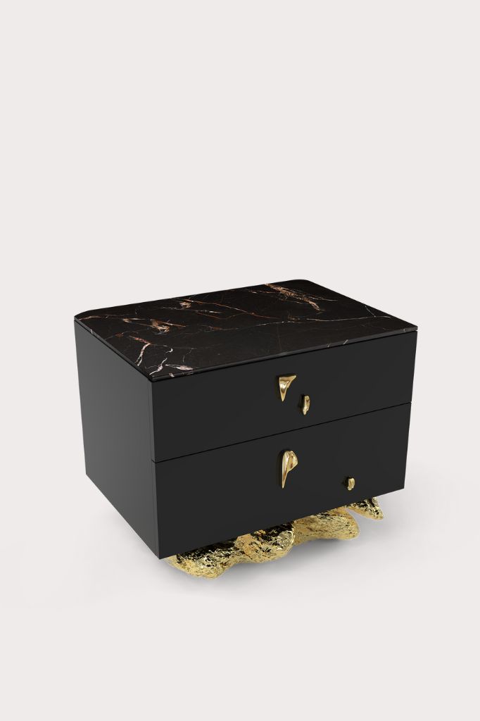 Szafka nocna Angra stanowi harmonijne połączenie sztuki i praktyczności. Elegancko prezentuje się na unikalnej, zakrzywionej złotej podstawie, inspirowanej urzekającymi klifami Angra do Heroismo na portugalskich Azorach.