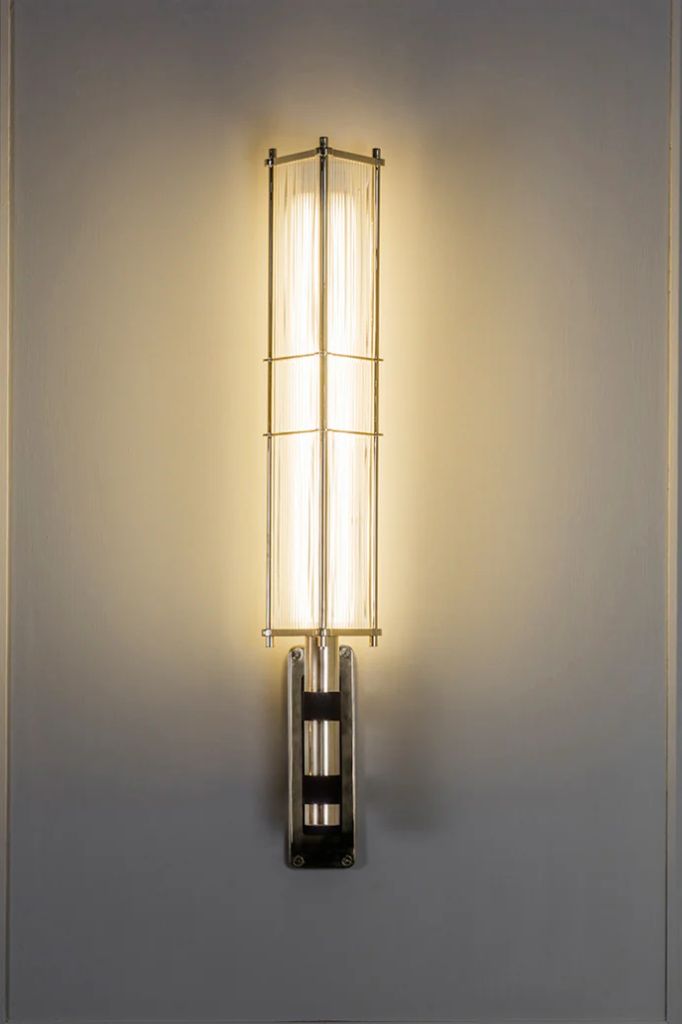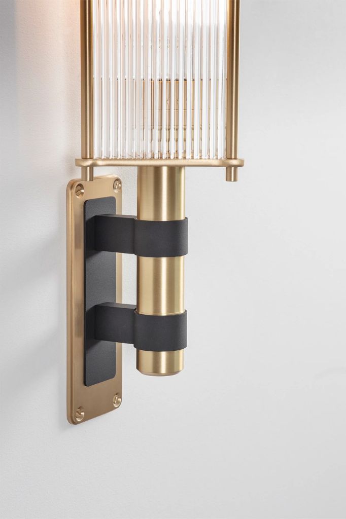 Przezroczyste akrylowe lamele i obrabiany maszynowo lity mosiądz podkreślają ten przyciągający wzrok liniowy design, który zwraca uwagę w każdej przestrzeni.