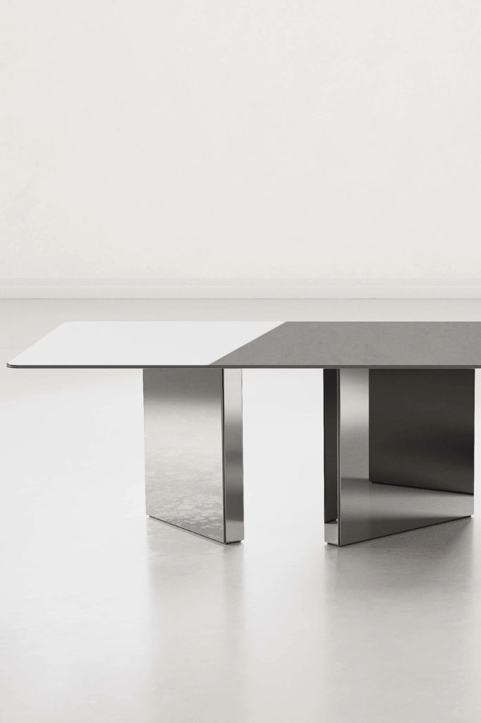 Wykonany z lustrzanego blatu połączonego z płytą ze szkła hartowanego, wyciętego diamentowo , wspartego na trzech asymetrycznych nogach, wykonanych z drewnianej konstrukcji pokrytej lustrem.