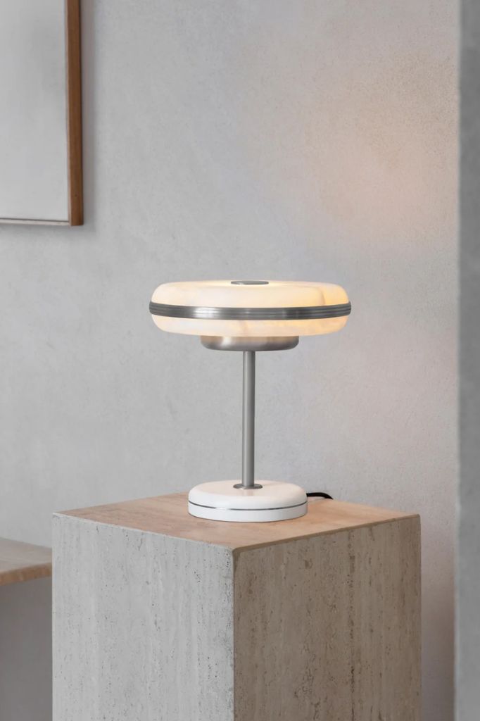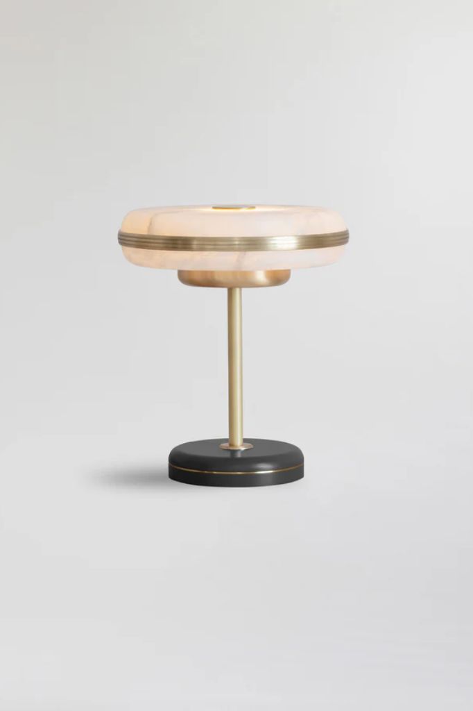 Klosz z naturalnego kamienia alabastrowego jest elegancko osadzony na solidnym mosiężnym stojaku i malowanej proszkowo podstawie, tworząc stylową lampę stołową na każdy blat. Kontrastujące opcje kolorystyczne podstawy mogą przekształcić produkt z bardziej powściągliwego przedmiotu w zachwycający element dekoracyjny.