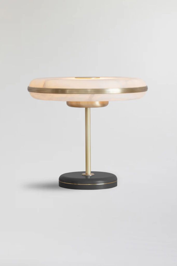 Klosz z naturalnego kamienia alabastrowego jest elegancko osadzony na solidnym mosiężnym stojaku i malowanej proszkowo podstawie, tworząc stylową lampę stołową na każdy blat. Kontrastujące opcje kolorystyczne podstawy mogą przekształcić produkt z bardziej powściągliwego przedmiotu w zachwycający element dekoracyjny.