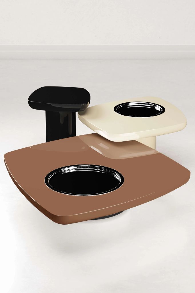 Blackbird coffee tables, available in three versions. Glossy or matte lightened wood top, in the Giopagani crayon color selection, supported by a metal plate, which anchors the top to the base.