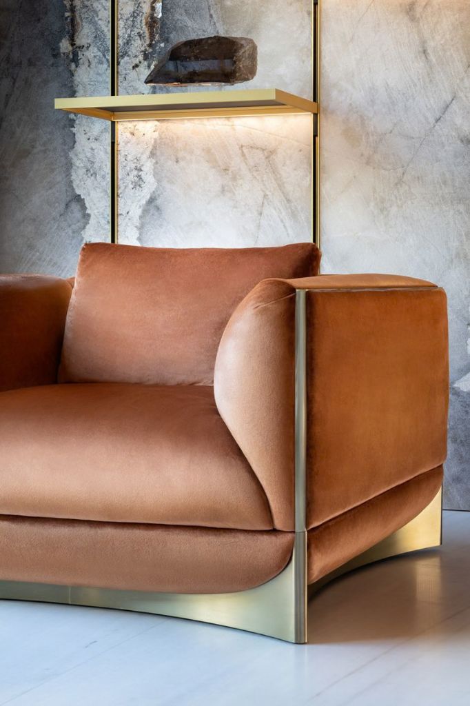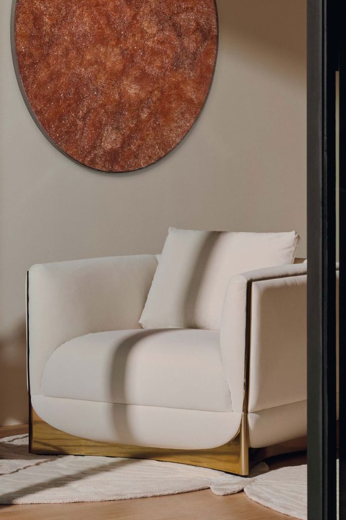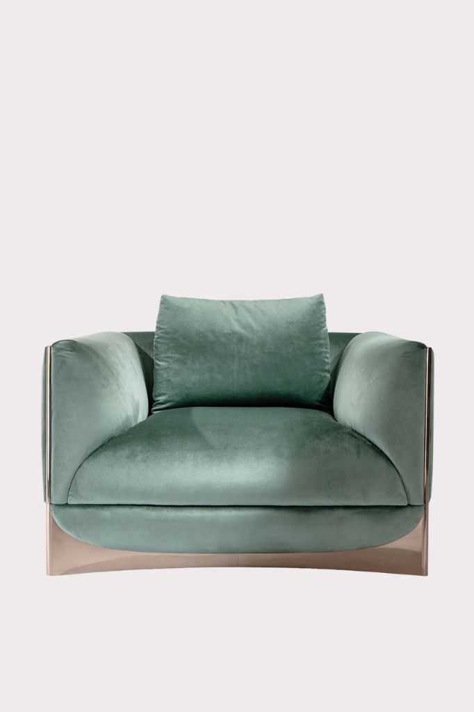 Armchair with fixed upholstery in leather or fabric, featuring a solid and multilayer wood structure with elastic webbing suspension. The seat, backrest, and armrests are padded in single compartments with polyurethane, Memory Foam, and feather. The sculpted base is clad in curved stainless steel, while polished metal trim outlines the lateral volumes, available in a curated selection of metallic finishes.