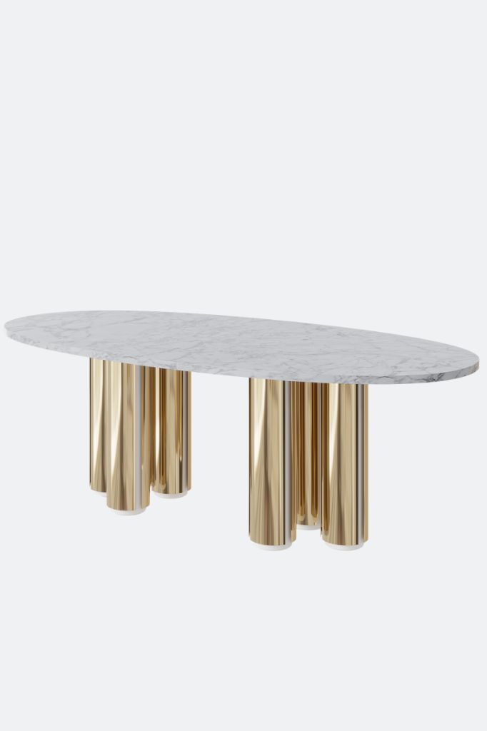 A dining table where light meets stone and metal. The marble top reveals its unique texture, capturing every nuance of natural light. Legs with subtle metallic details reflect a delicate glow that shifts throughout the day.świat bronson: