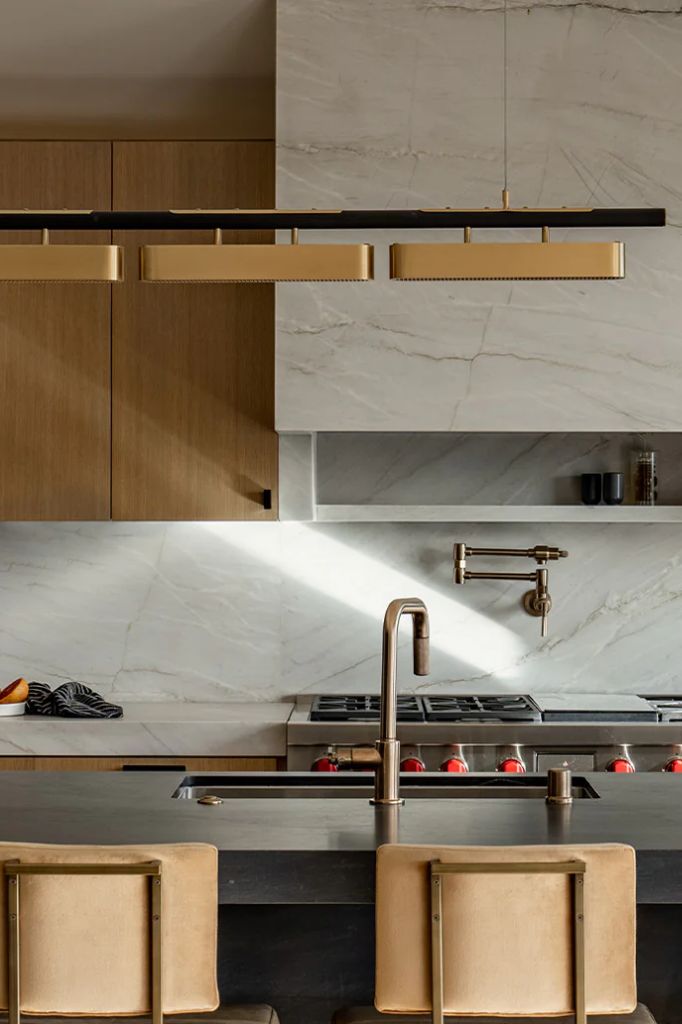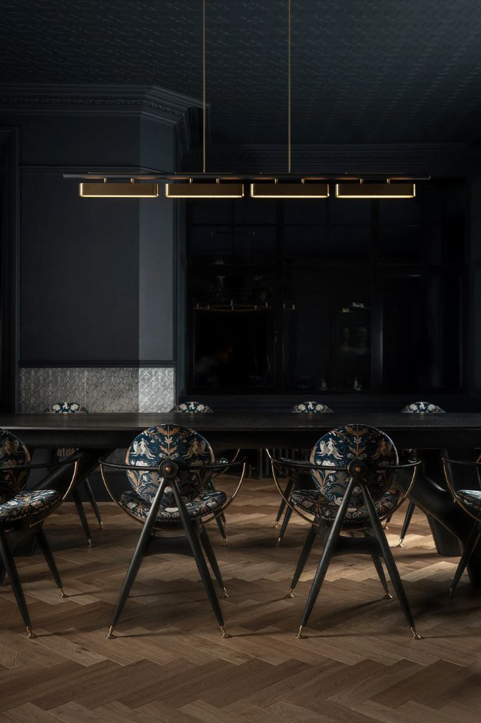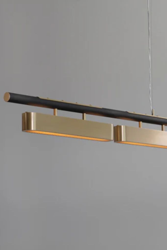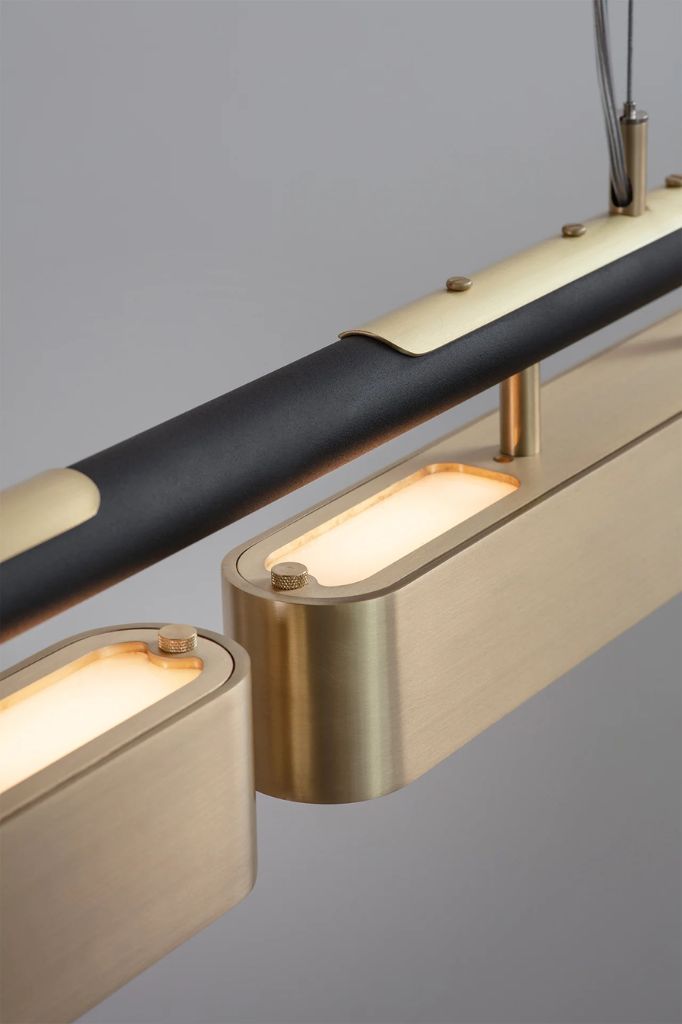 Pięć lamp to lepsze rozwiązanie niż jedna. Potrójne kratki z odlewanego mosiądzu ze szczelinowymi opalowymi dyfuzorami są utrzymywane w linii przez teksturowane czarne wykończenie całej lampy.