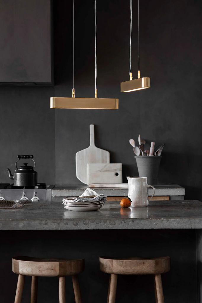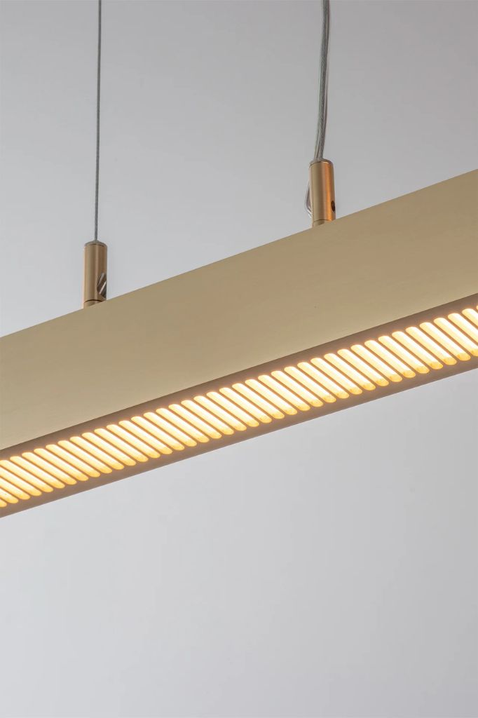 Obrabiany maszynowo ciężki mosiądz i smukły, szczelinowy dyfuzor rzuca miękkie światło na sufit i podłogę.