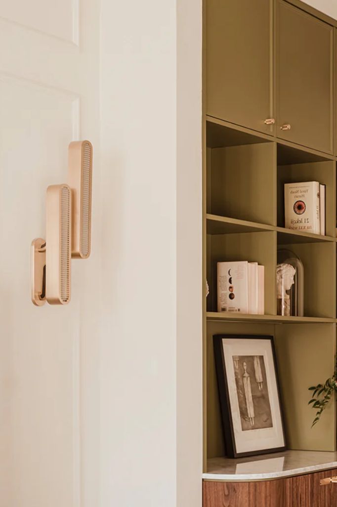 Podwójne, dopasowane klosze z odlewanego mosiądzu na smukłych, przeciwległych ramionach. Opalowe dyfuzory rzucają ciepłe światło wokół i na eleganckie krzywizny mosiężnej płyty ściennej.