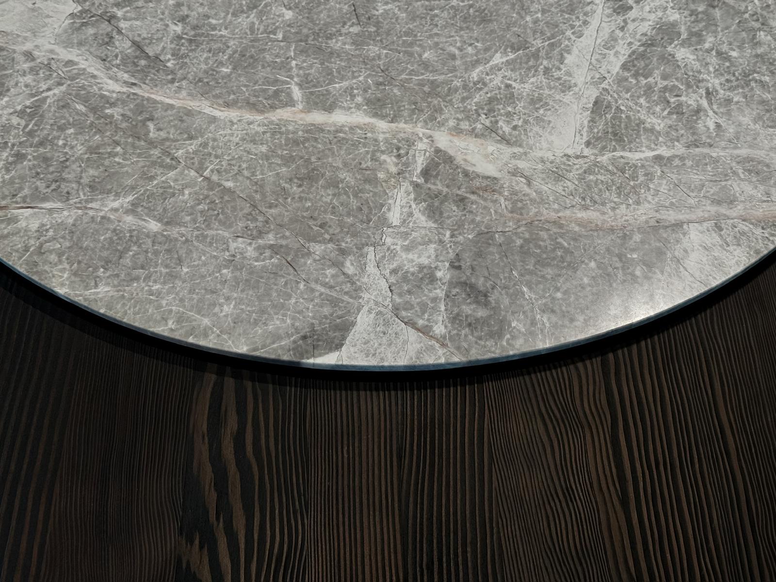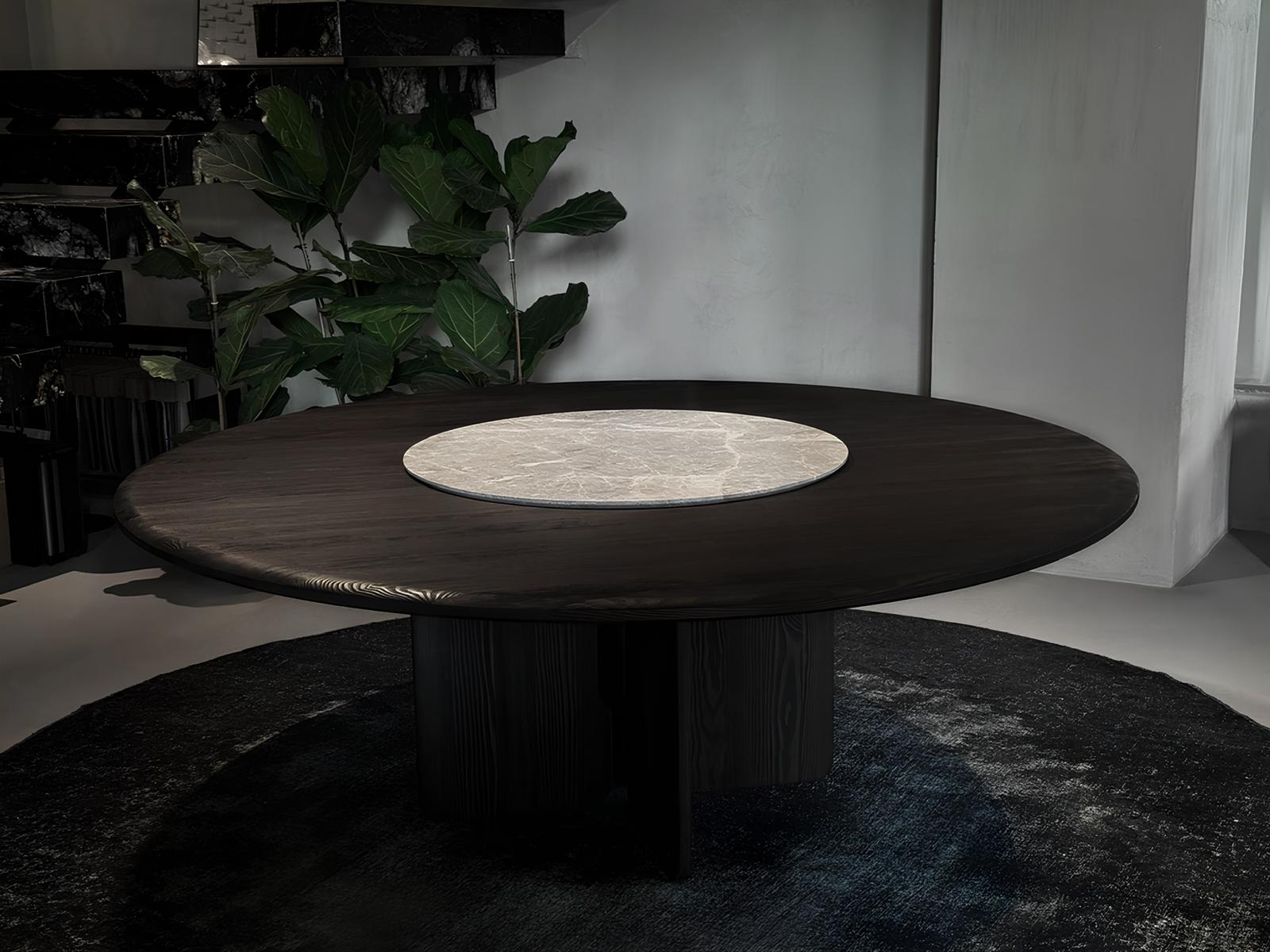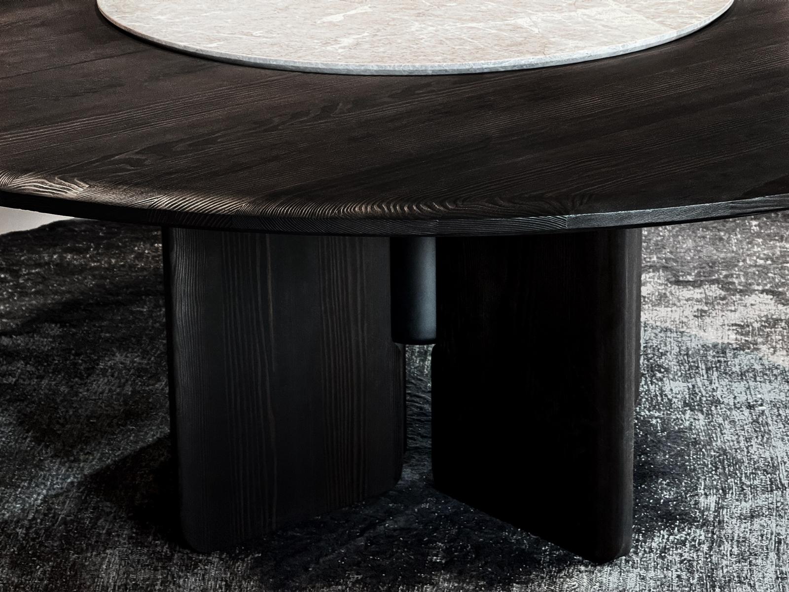Faifo is a unique collection of dining tables inspired by various cultures from around the world, particularly those of the Far East. The round tabletop, enhanced with a rotating tray made of natural marble, makes for a perfect addition to any dinner. The hand-finished Faifo wood, carefully selected and crafted, brings not only elegance but also coziness and warmth to any interior. It serves as an ideal centerpiece for any dining space.