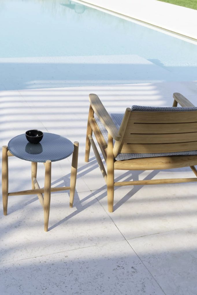 The lounge armchair – made of natural teak – is characterised by horizontal cuts along the back and seat that lighten the aesthetics and soften the shapes. Cushions, removable cover.