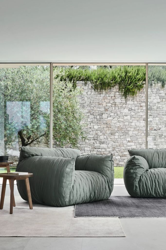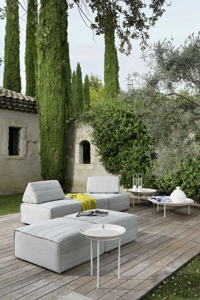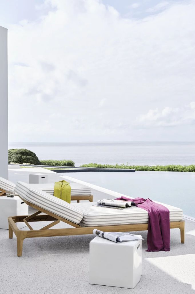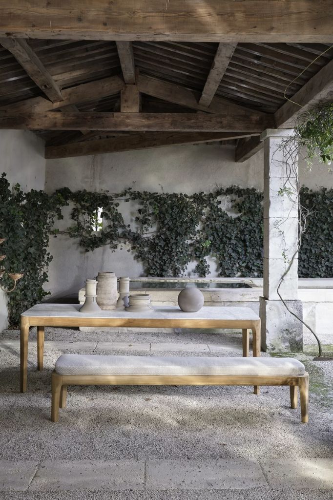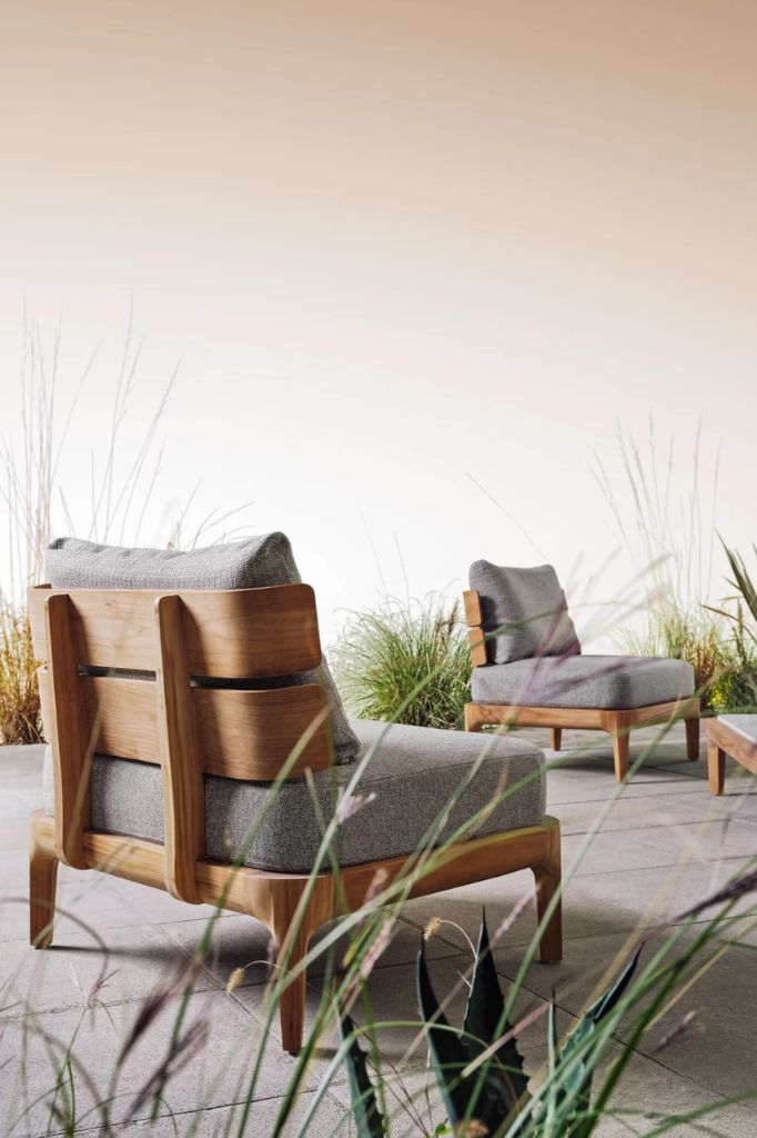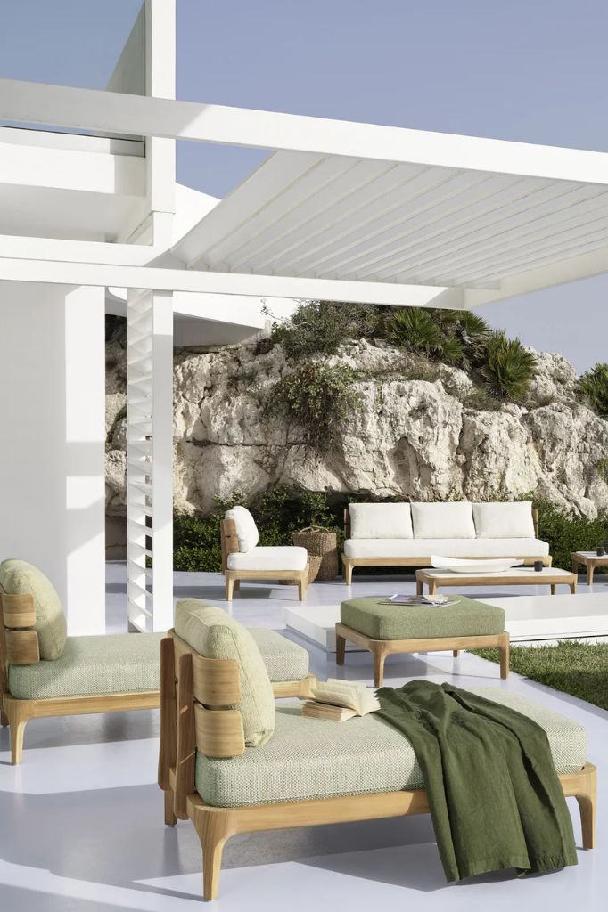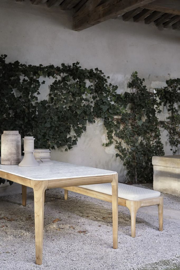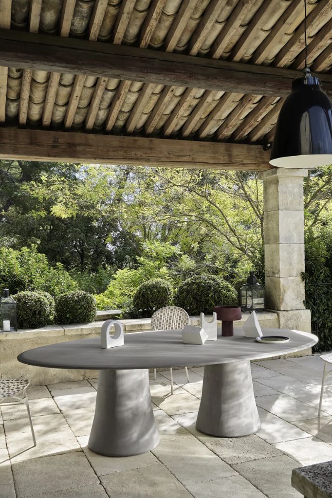 The round table, with a teak structure, offers tops in Pearl concrete, Lava Stone gres, or textured Slate gray glass, combining essential design and refined materials for elegant and functional outdoor spaces.