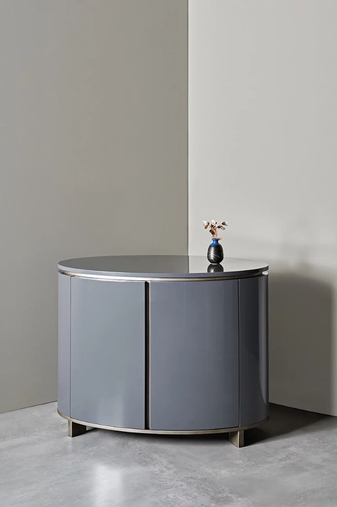 Ronny to cylindryczny stolik nocny dostępny z szufladami lub drzwiami, charakteryzujący się wklęsłym frontem i obniżonym blatem, który może być - podobnie jak rama - pokryty błyszczącym lub matowym lakierem lub wykonany z marmuru.STONE UP