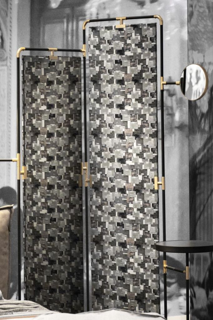 Elysée to idealna przegroda do salonu. Cienka metalowa konstrukcja ozdobiona pozłacanymi detalami, mieszcząca dwa panele – jeden z bocznym lustrem, drugi pokryty eleganckimi tkaninami i jedwabiami z kolekcji Redaelli.