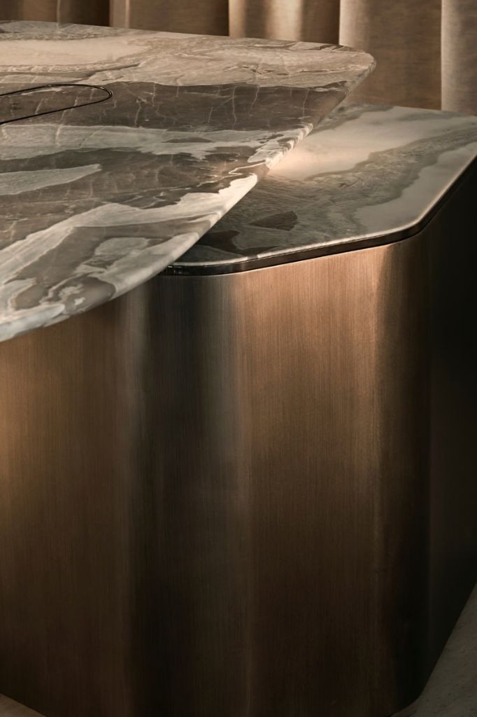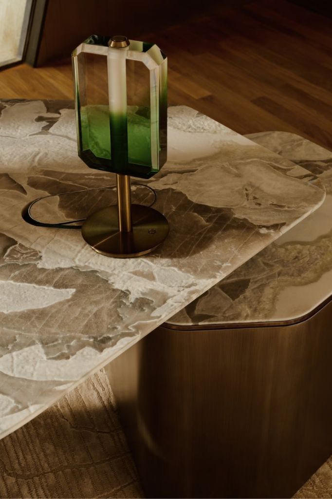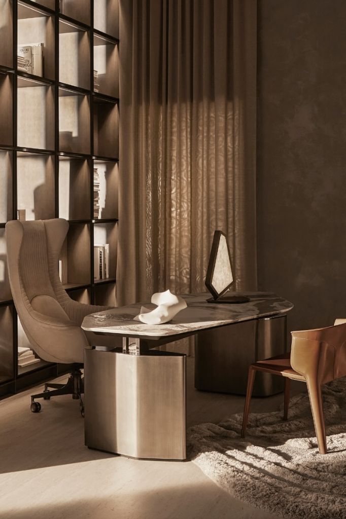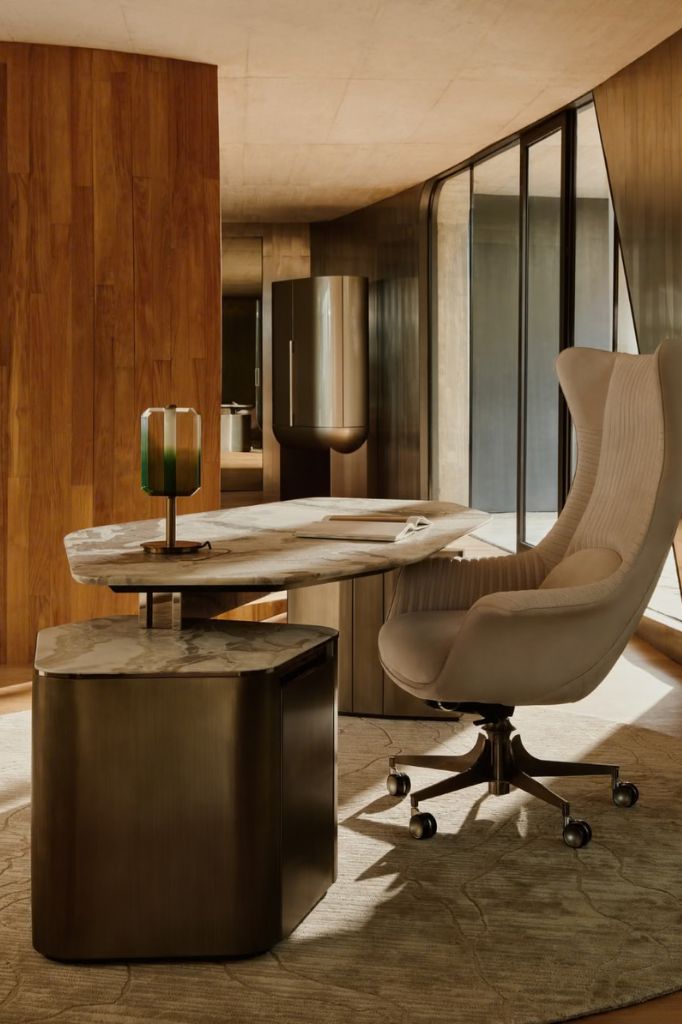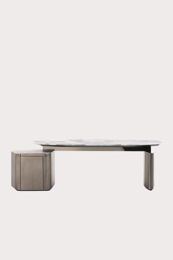 Desk with a metal structure and double-level marble top, defined by an asymmetrical geometry and a leather-finished surface. A monolithic central beam supports one leg and a drawer unit, both clad in satin-finished steel or leather.