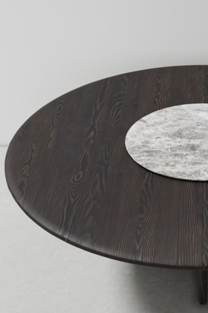 The round tabletop, with a complement of the Lazy Susan made of natural marble on its largest variation, is a tribute to gatherings and conviviality surrounding traditional dining tables.