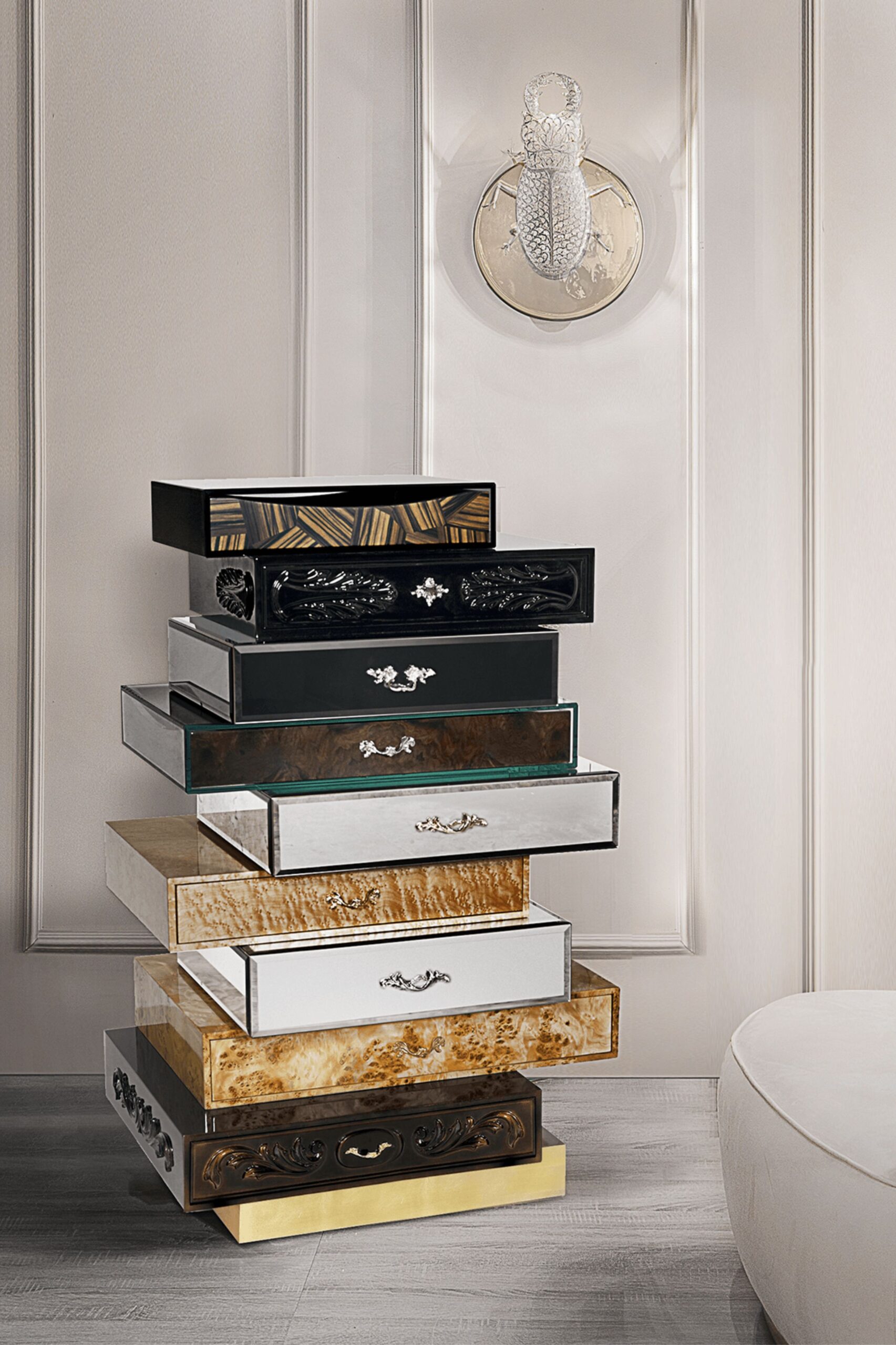 Uchwycając piękno i ponadczasowy urok lasu, wybitny Frank oddaje hołd spadającej wodzie Franka Lloyda Wrighta. Świetliste tekstury egzotycznego drewna, metalicznych liści, lakierów, szkła i lustra przeplatają się w rytmicznie kaskadowych szufladach.