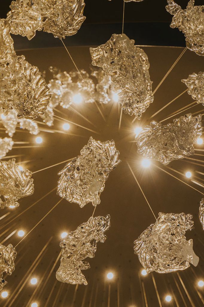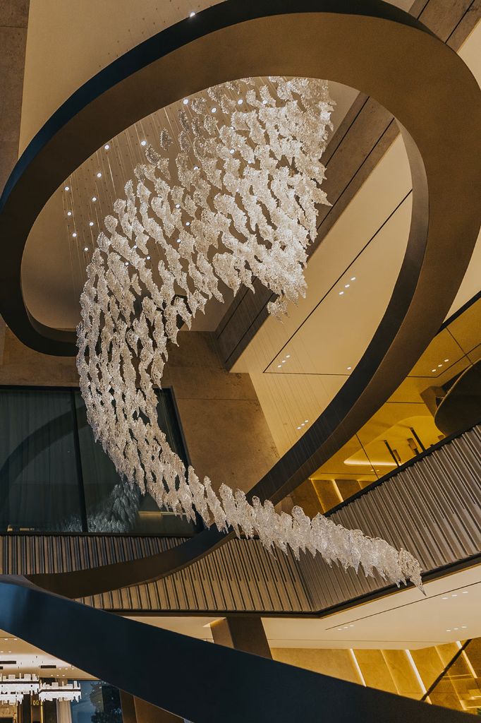 The design is taken from Sans Souci’s FROSTY LEAVES collection and features individual hand-blown glass components in crystal colour with mica and a stainless-steel finish. Each component is suspended in a specially designed formation to create a dramatic swirl through the atrium, drawing your gaze upwards.