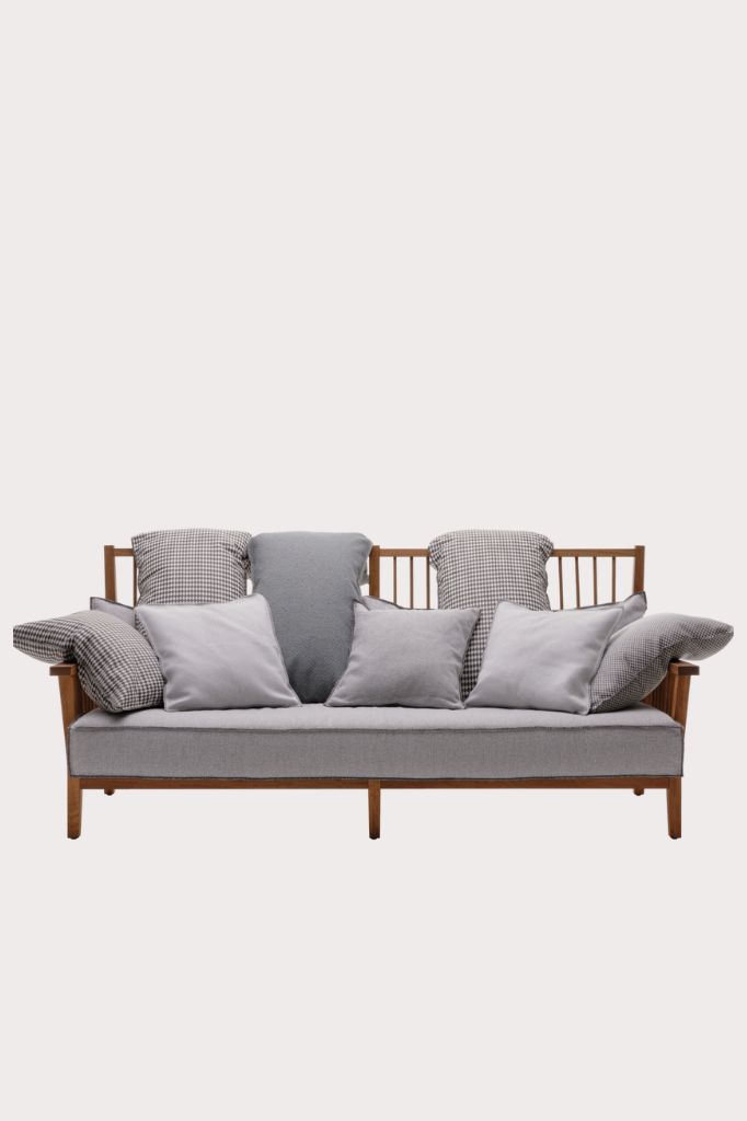 A comfortable and cozy sofa made of oiled iroko wood, which is exceptionally durable as it is naturally resistant to water and moisture. The contrast between the solidity of the wide slats and the softness of the removable cushions made of waterproof polyurethane foam makes this piece of furniture both sophisticated and functional.