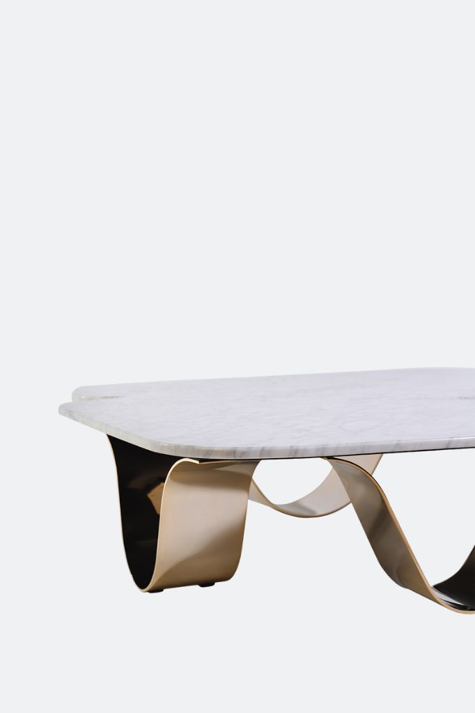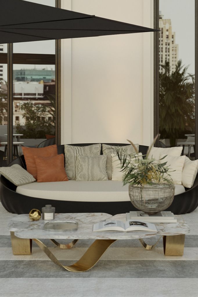 The Kai outdoor coffee table combines design with light and wavy shapes, using materials such as marble and stainless steel with premium finishes, making it visually appealing. A large table that meets the requirements of a lounge space, drawing attention with its bold presence.