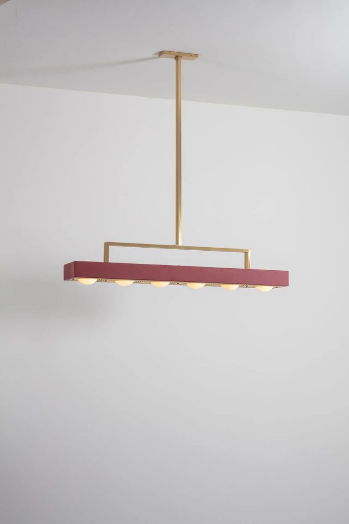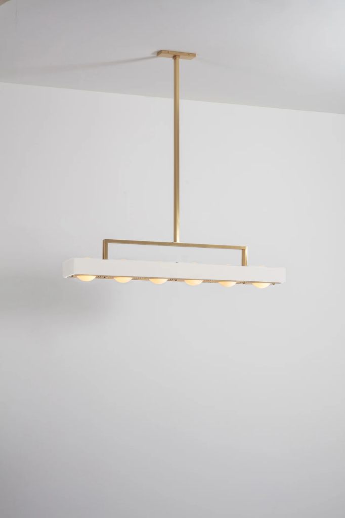 Sześć kul z opalowego szkła oprawionych w prostokątny, lakierowany na mat klosz z laserowo wyciętym mosiężnym dyfuzorem. Wsparta na solidnym, mosiężnym drążku.
