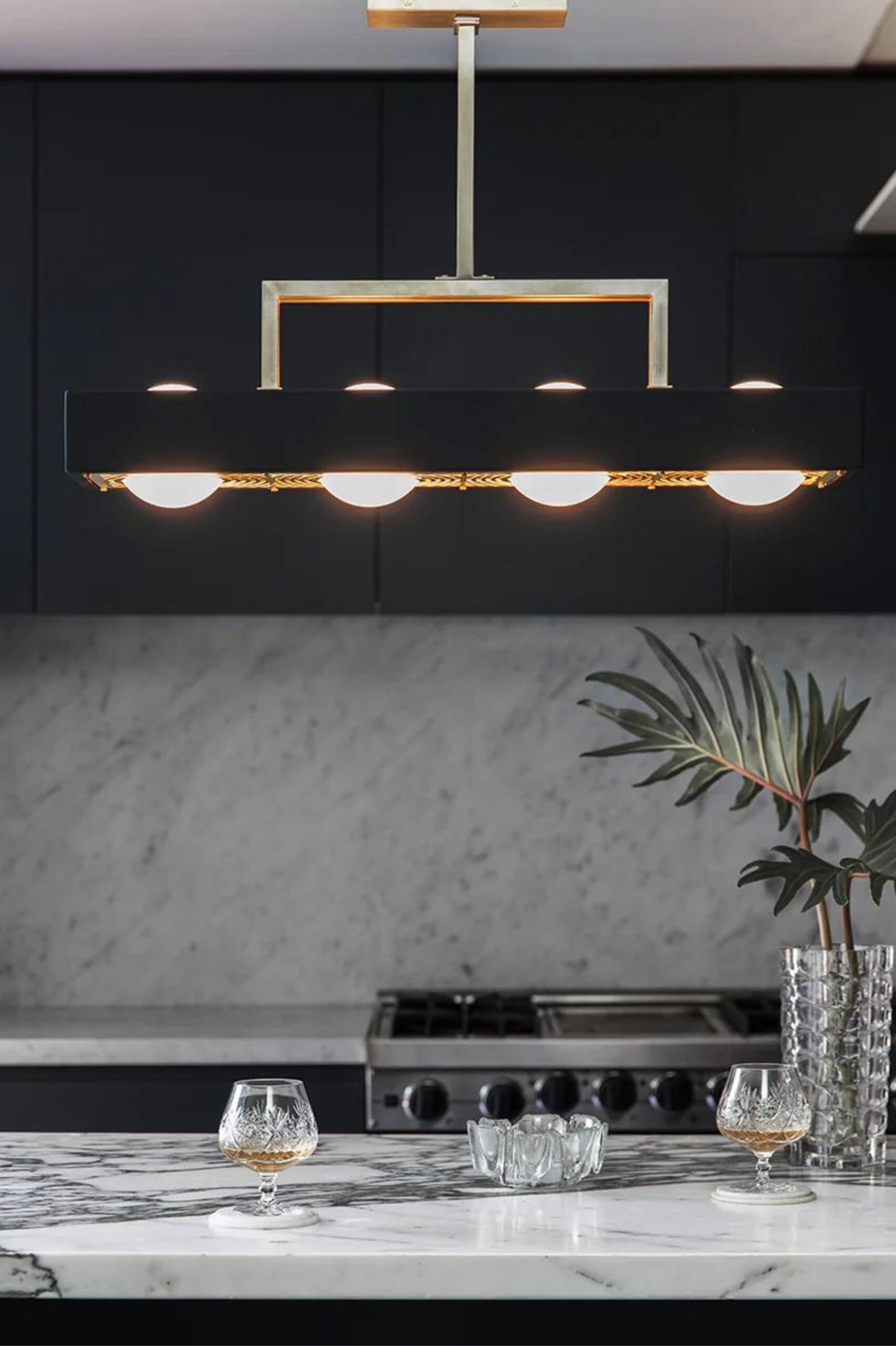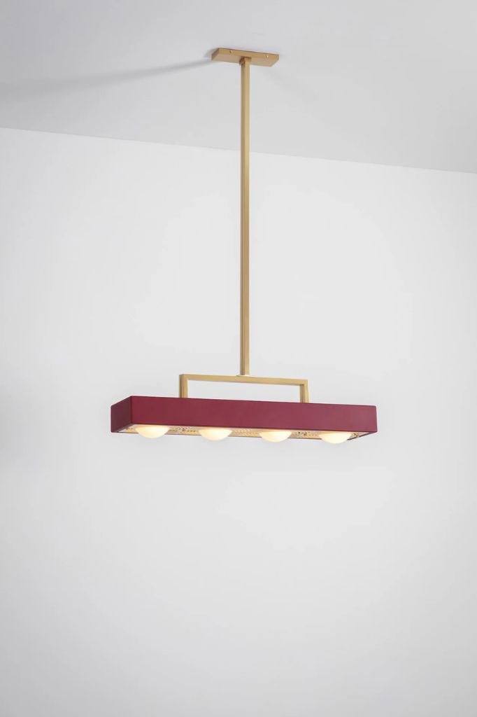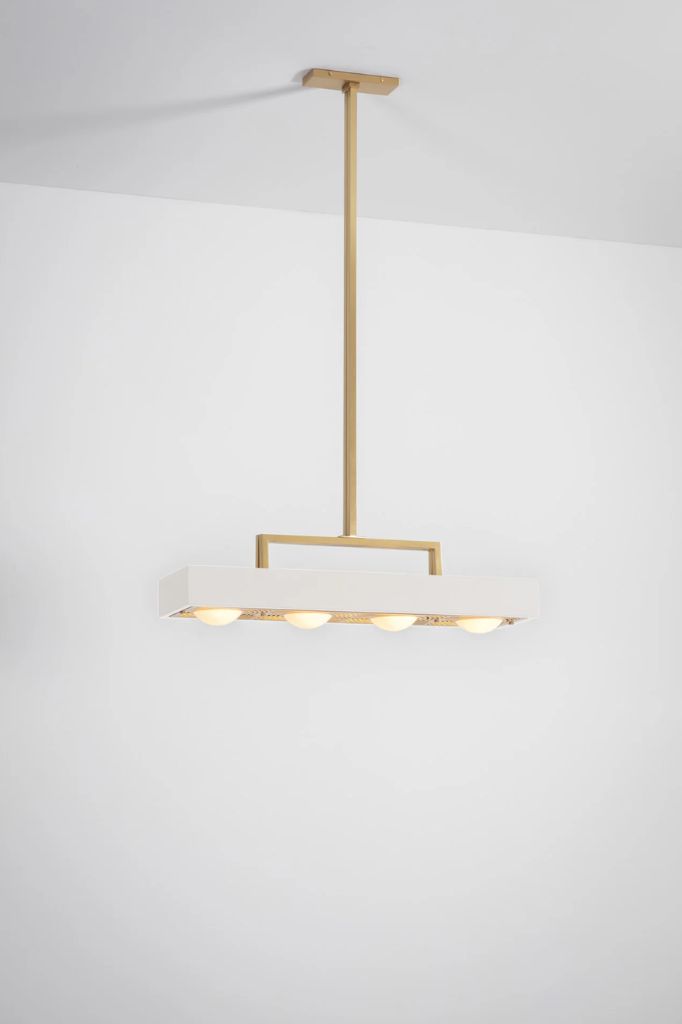 Cztery opalowe szklane kule oprawione w matowy lakierowany prostokątny klosz. Laserowo wycinany mosiężny dyfuzor odzwierciedla kształt zamkniętych kul.