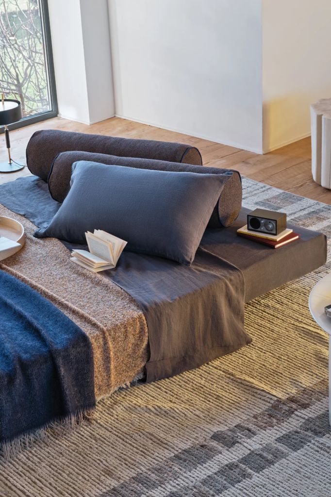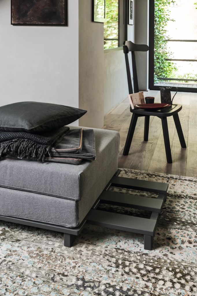 Kubo is a freestanding bed that offers a new interpretation of the typical oriental bed. Its main feature is its transformability: the removable slatted base hidden under the foldable mattress slides out in one movement, allowing the pouf to be converted into a sofa, single bed, or double bed. Its versatility and space-saving design make it ideal for rooms of various sizes, from living rooms and studies to bedrooms.