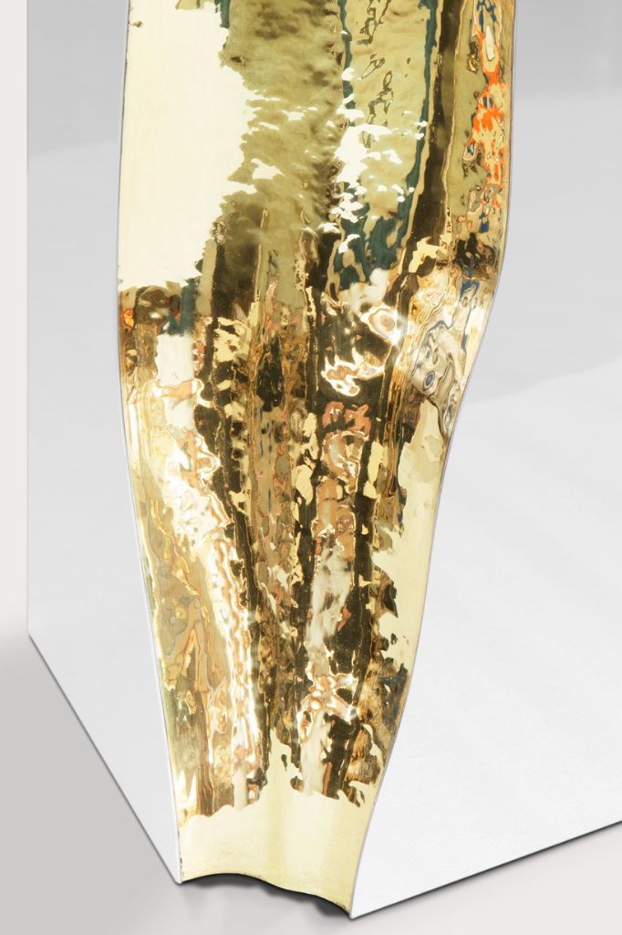 Organiczne formy zostały uzyskane poprzez ręczne dopasowanie polerowanej blachy mosiężnej, a zdecydowany charakter dzięki polerowanej stali nierdzewnej tworzącej idealne lustro.LAPIAZ MODULAR SOFA