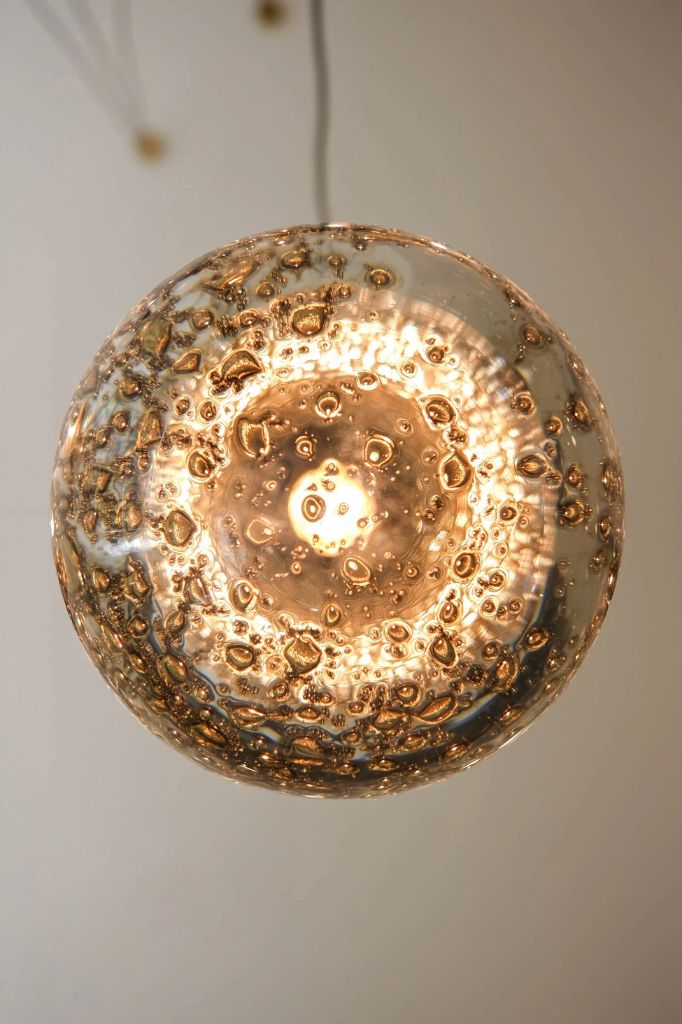 Each glass sphere is formed by hand using a technique reminiscent of the mastery of Venetian artisans. The glass, placed on a platform and dipped in brass dust that clings to the surface like precious memories, takes the form of a drop symbolizing rebirth and transformation.