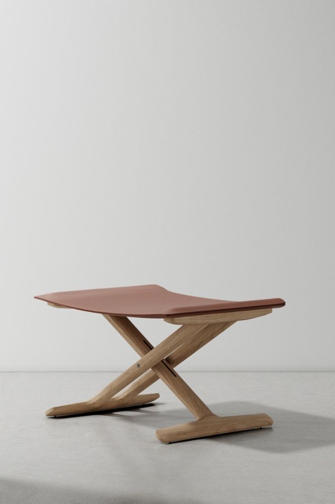 The concept of a folding chair is revisited in an elegant, timeless profile meticulously crafted in wood and saddle leather.
