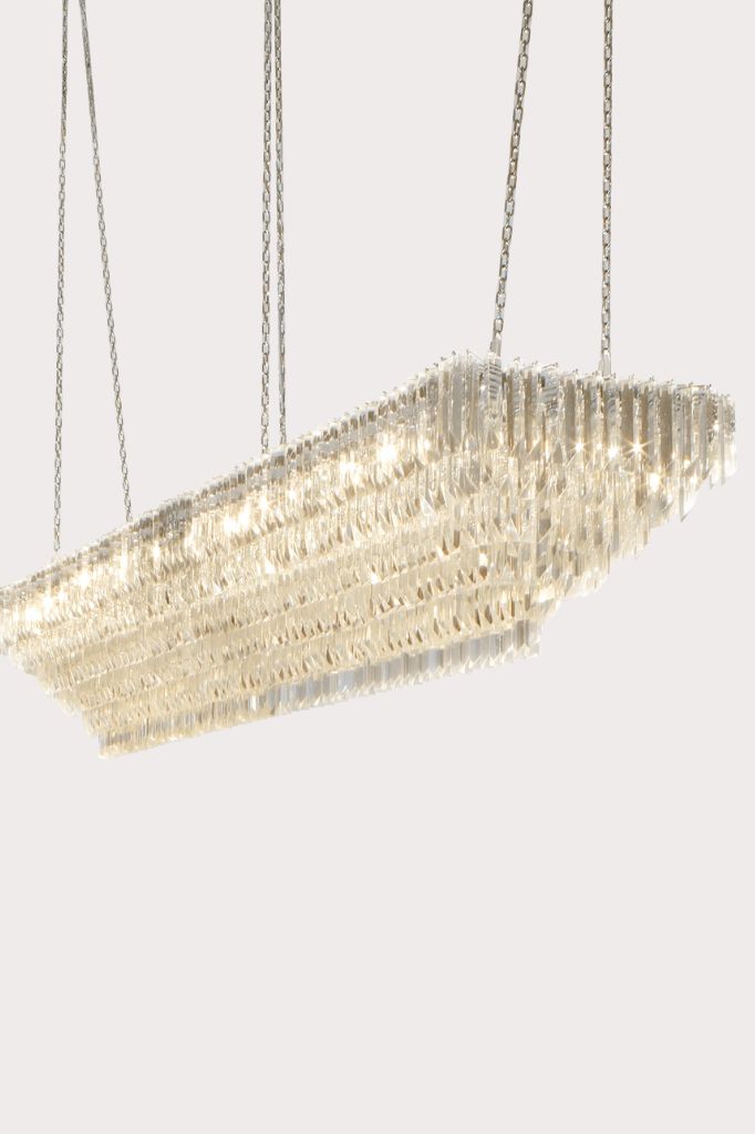 Suspension lamp with chrome steel frame, adorned with 45°-cut crystal trihedron pendants in a pyramidal arrangement. Available in two configurations and sizes, it stands out for its brilliant materiality and geometric rigor.
