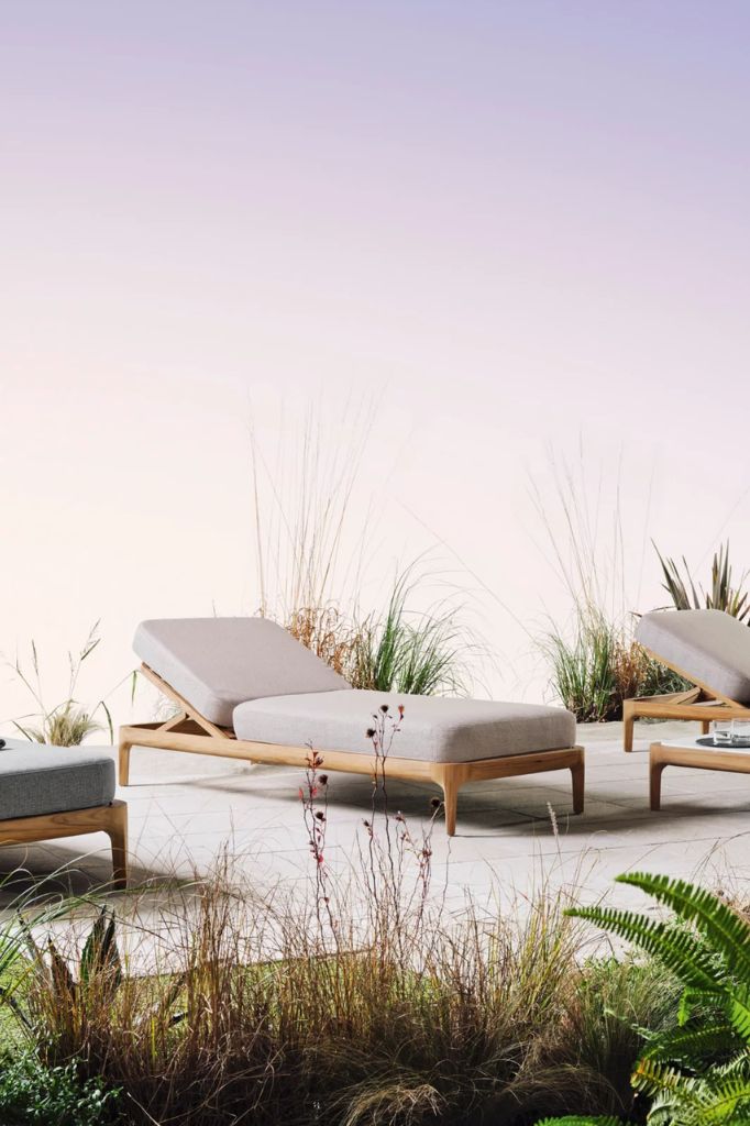 An elegant chaise longue with a teak wood frame, adjustable backrest, and mattress with a removable cover.