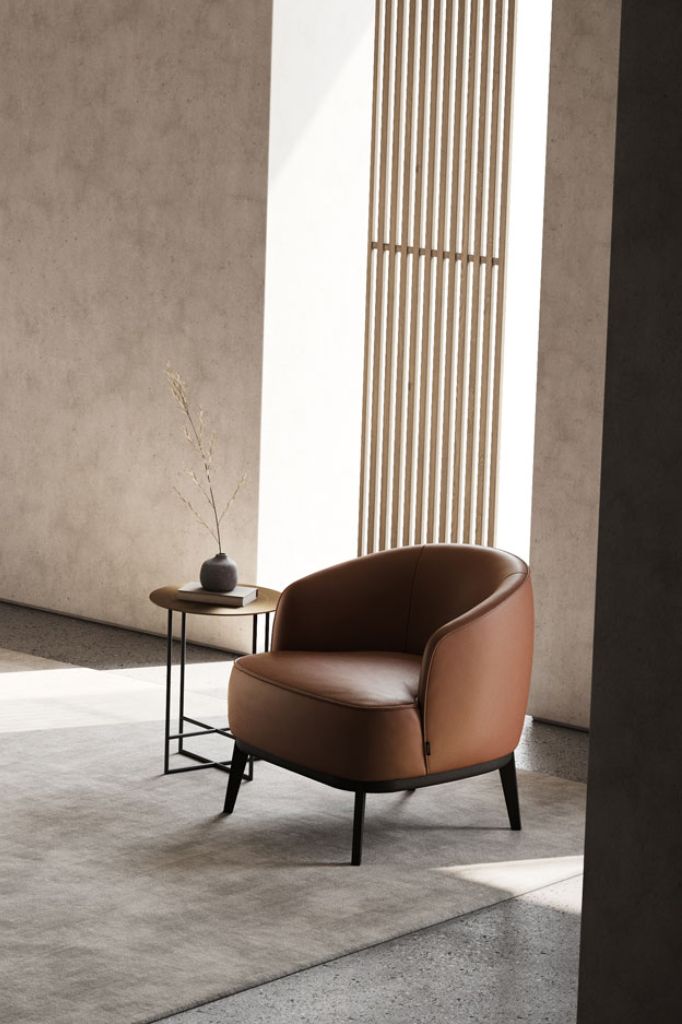 Jermain stars a convex back that elongates to a discreet armrest with a slight open bend for extreme comfort. Also, an elegant opening on the back brings a touch of contemporary style.