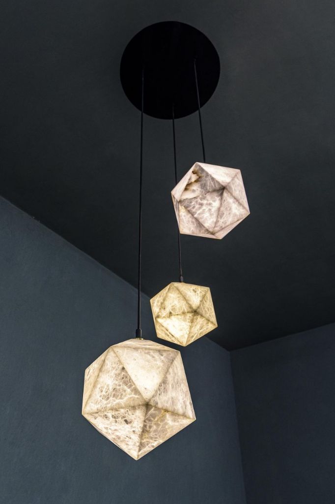 The Meteorite alabaster pendant lamp reflects a unique and personal style with a distribution of 6 luminaires. Its cut, like that of a precious stone, in the shape of an icosahedron, determines the unique and special shape of this lamp designed in alabaster. The Meteorite collection can be suspended from the ceiling in sets of 3, 6 or 12 luminaires to adapt to the lighting that is to be provided in each space and has different possibilities of configuration of finishes based on the ceiling and electrical cable.