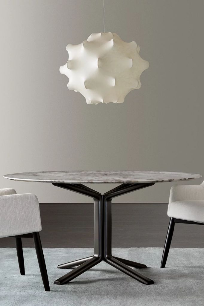 This dining table is strongly defined by the specular four-spokes base, symmetrical to the ones supporting the round top. Ample choice in the finishes for the tops: from wood to matt or glossy lacquer, up to the precious marble.