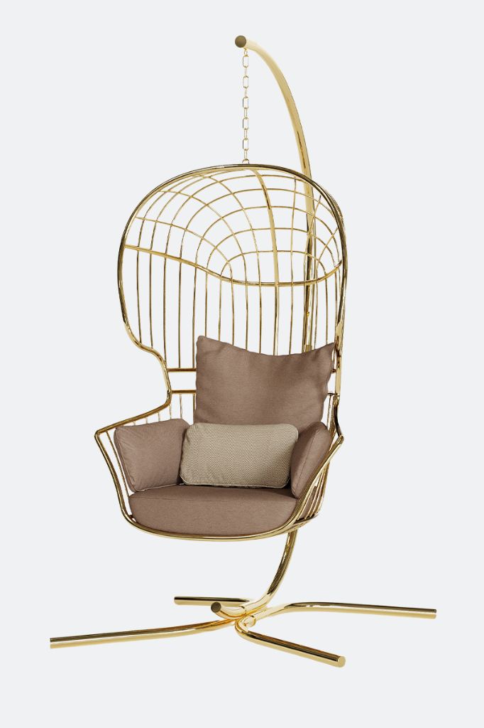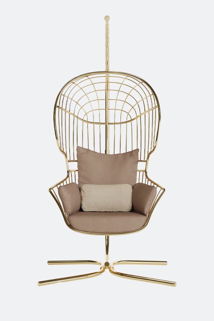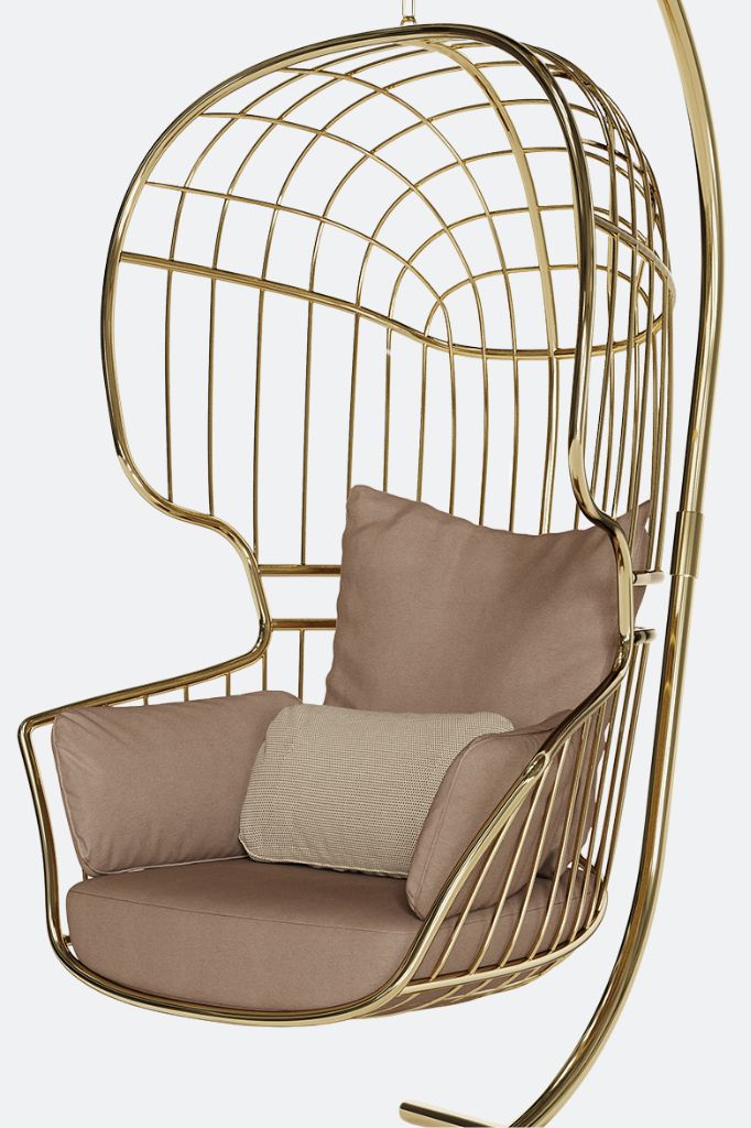 The Nodo Hanging Chair with Base combines durability with elegance, crafted from a coated stainless steel frame for optimal strength and outdoor resistance. Its golden accents bring an air of subtle sophistication, infusing contemporary outdoor settings with a refined, enigmatic elegance that captivates and inspires.
