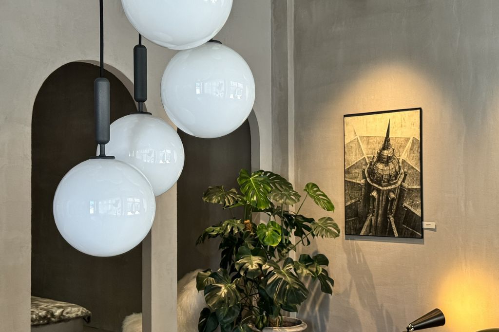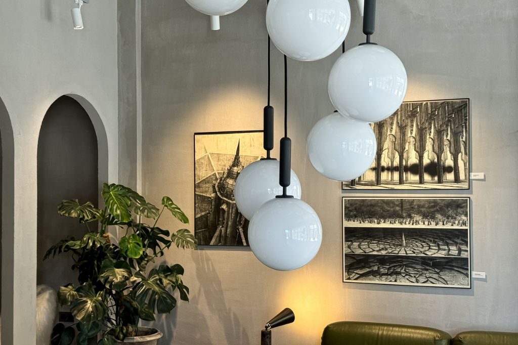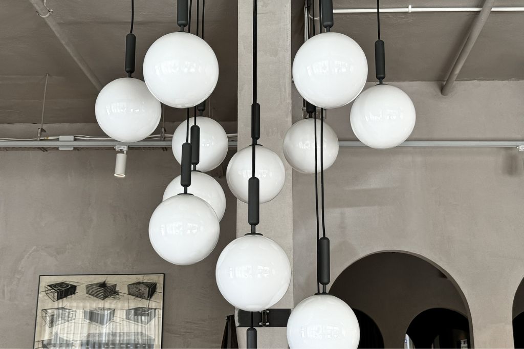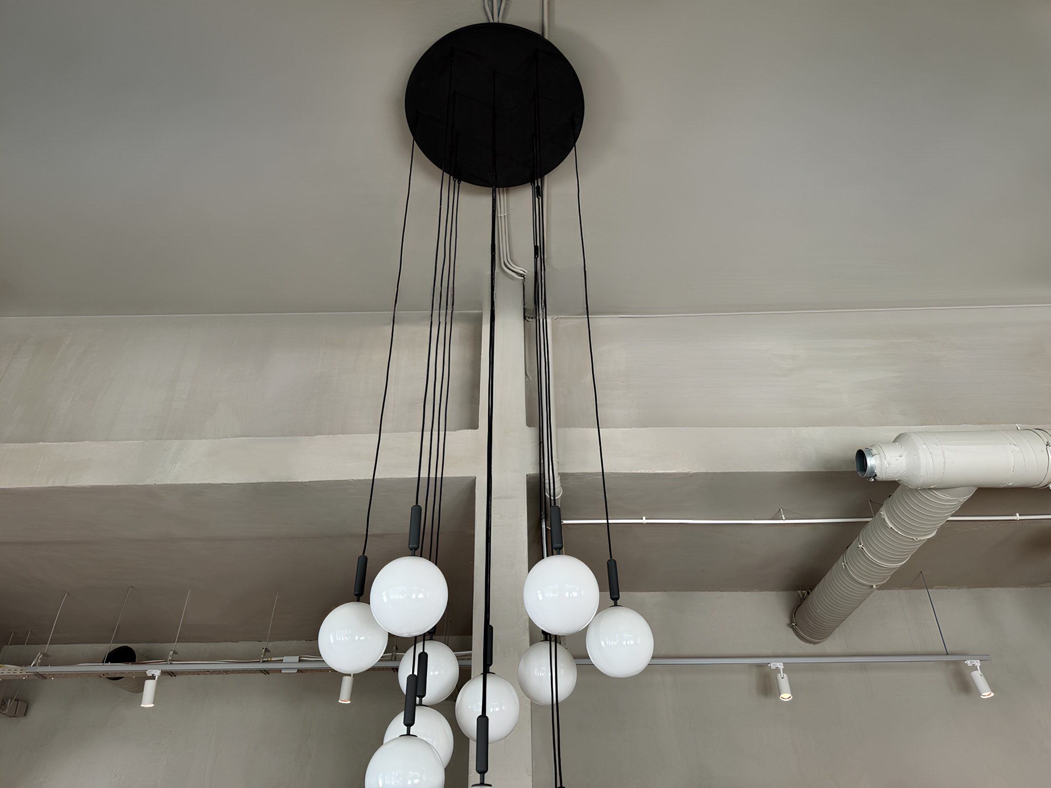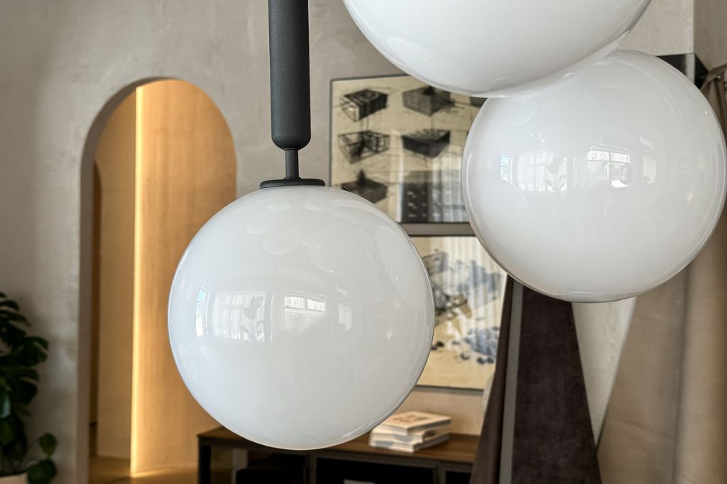 A lamp with a simple and timeless finish, designed in accordance with the philosophy of Scandinavian elegance. It is made of blown glass and powder-coated metal. The ceiling plate is included with the lamp.