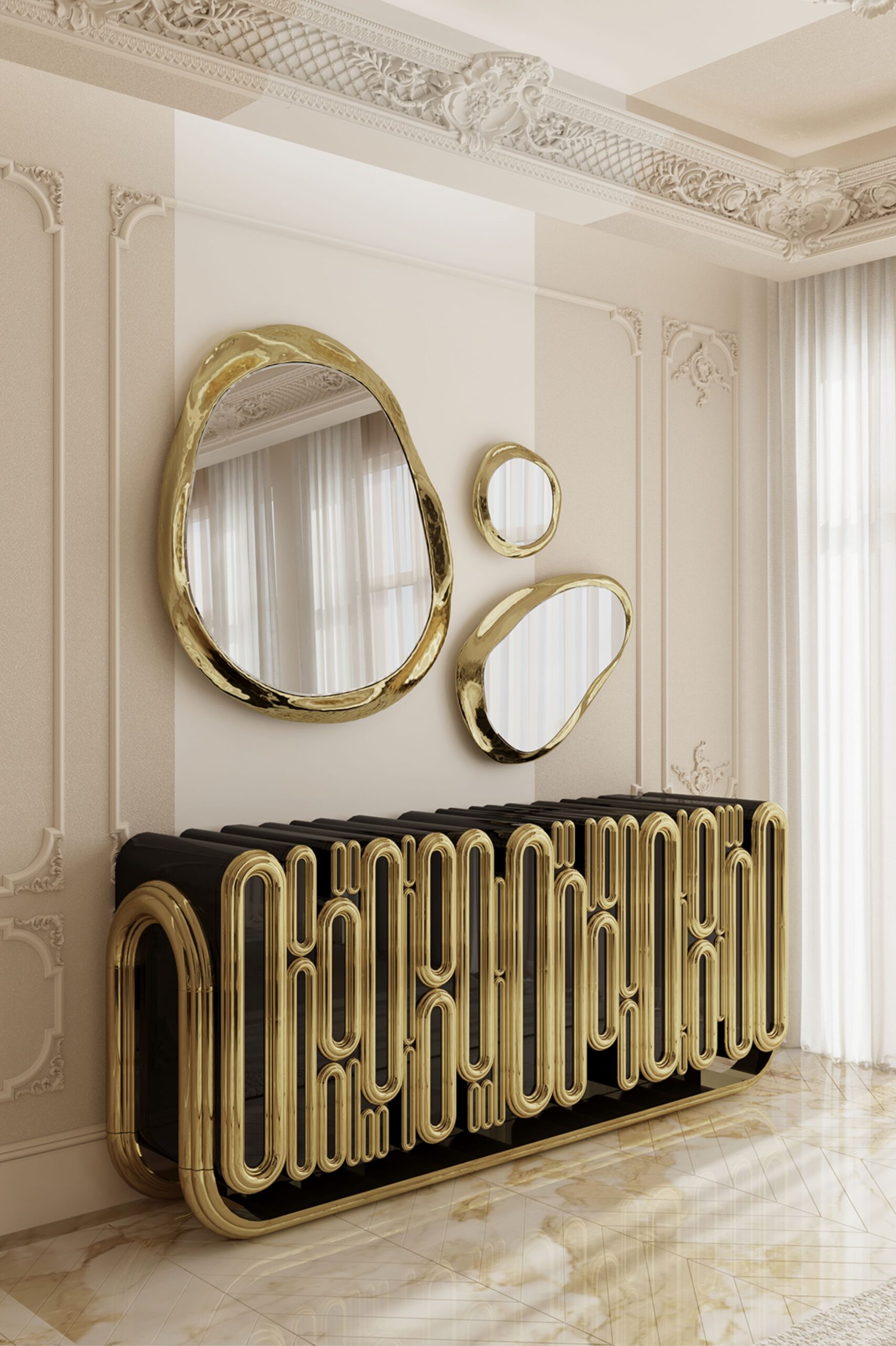 Inspired by the Swan Lake Op. 20, ballet composed by Pyotr Ilyich Tchaikovsky, Odette Modern Sofa. Its sweeping silhouette is accentuated with a polished brass structure and an asymmetric back that offers a sophisticated design and timeless appeal.LAPIAZ SIDEBOARD