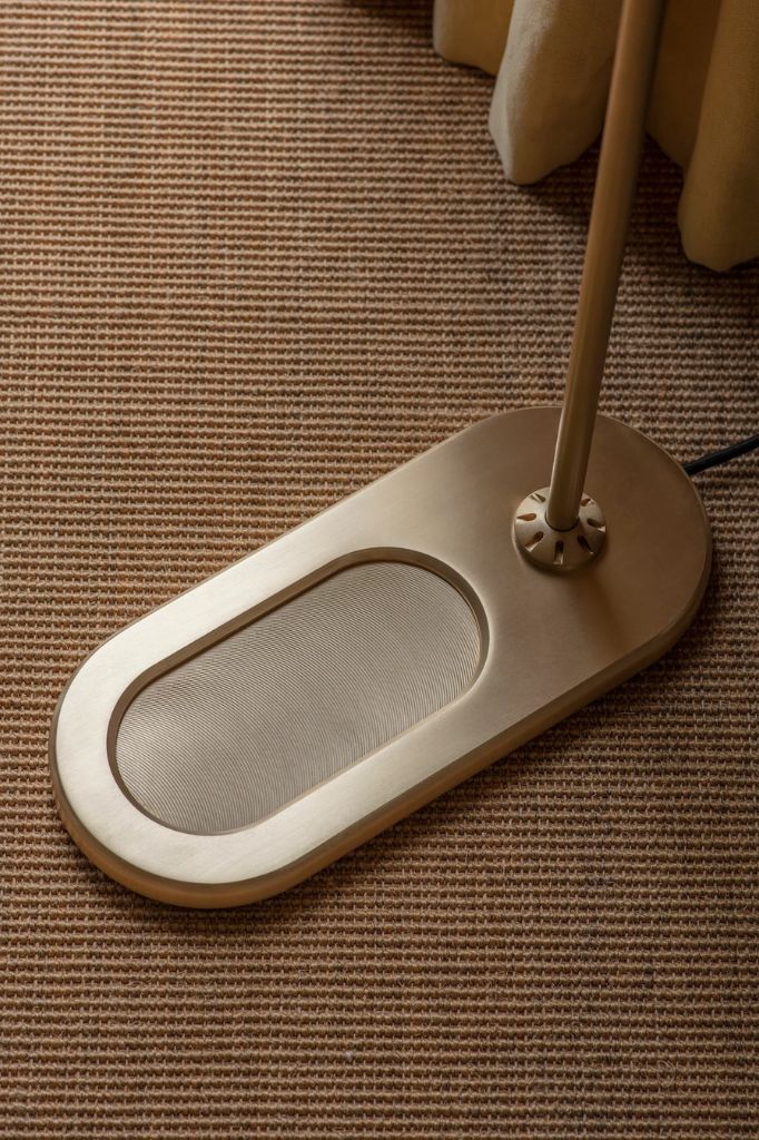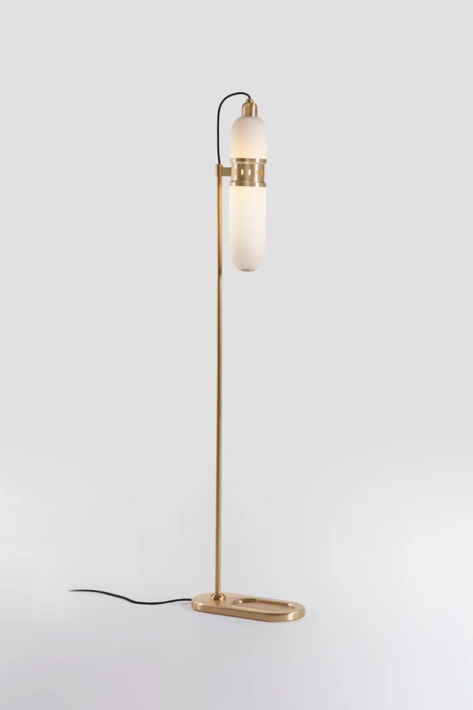Miękka, opalowa kapsuła zwisa wdzięcznie z opadającego przewodu, przymocowanego do podstawy ze szlifowanego mosiądzu.