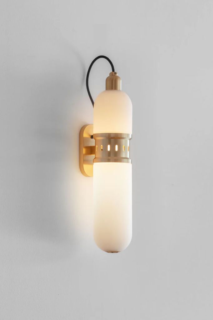 Przyciągająca wzrok cylindryczna lampa w kształcie kapsuły, zamknięta w precyzyjnie wykonanej oprawie ze szlifowanego mosiądzu.