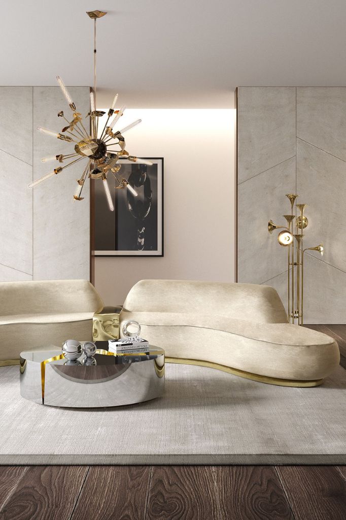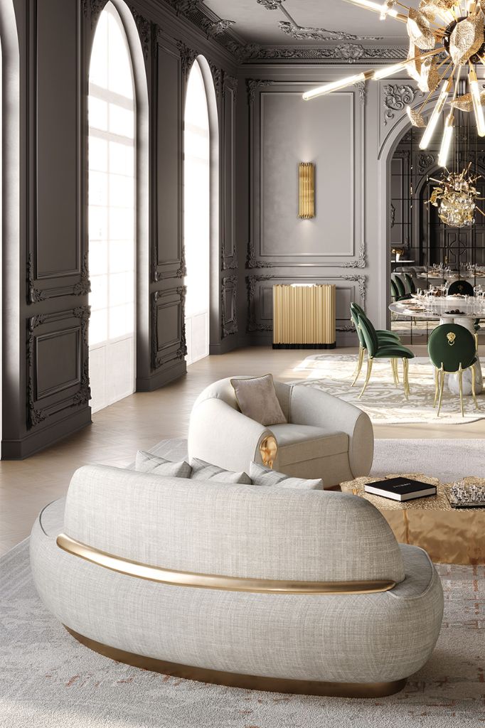 Inspired by the Swan Lake Op. 20, ballet composed by Pyotr Ilyich Tchaikovsky, Odette Modern Sofa. Its sweeping silhouette is accentuated with a polished brass structure and an asymmetric back that offers a sophisticated design and timeless appeal.