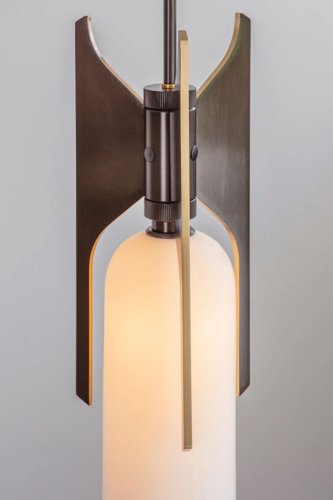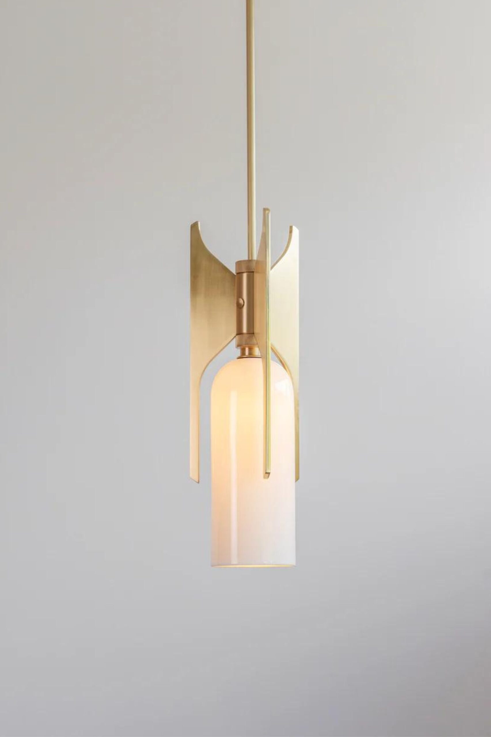 Trzy solidne, mosiężne lamele zabezpieczają delikatny dyfuzor z porcelany kostnej, a mosiężny pręt zapewnia wsparcie sufitowe.