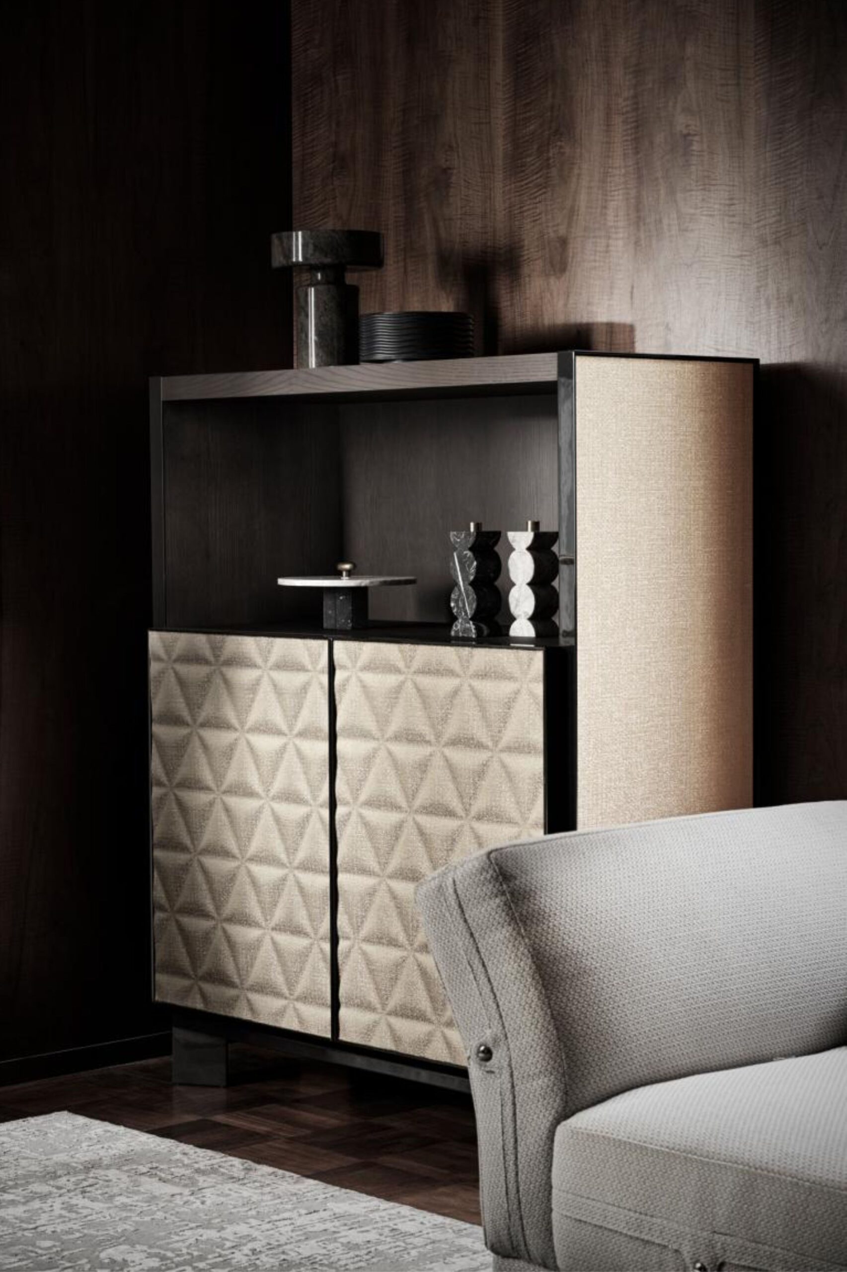 Różnorodność materiałów i wykończeń, które współgrają i uzupełniają się nawzajem, pozwala projektantom na wykorzystanie szafki Pique idealnie dopełniającą wyposażenia różnych przestrzeni w domu.