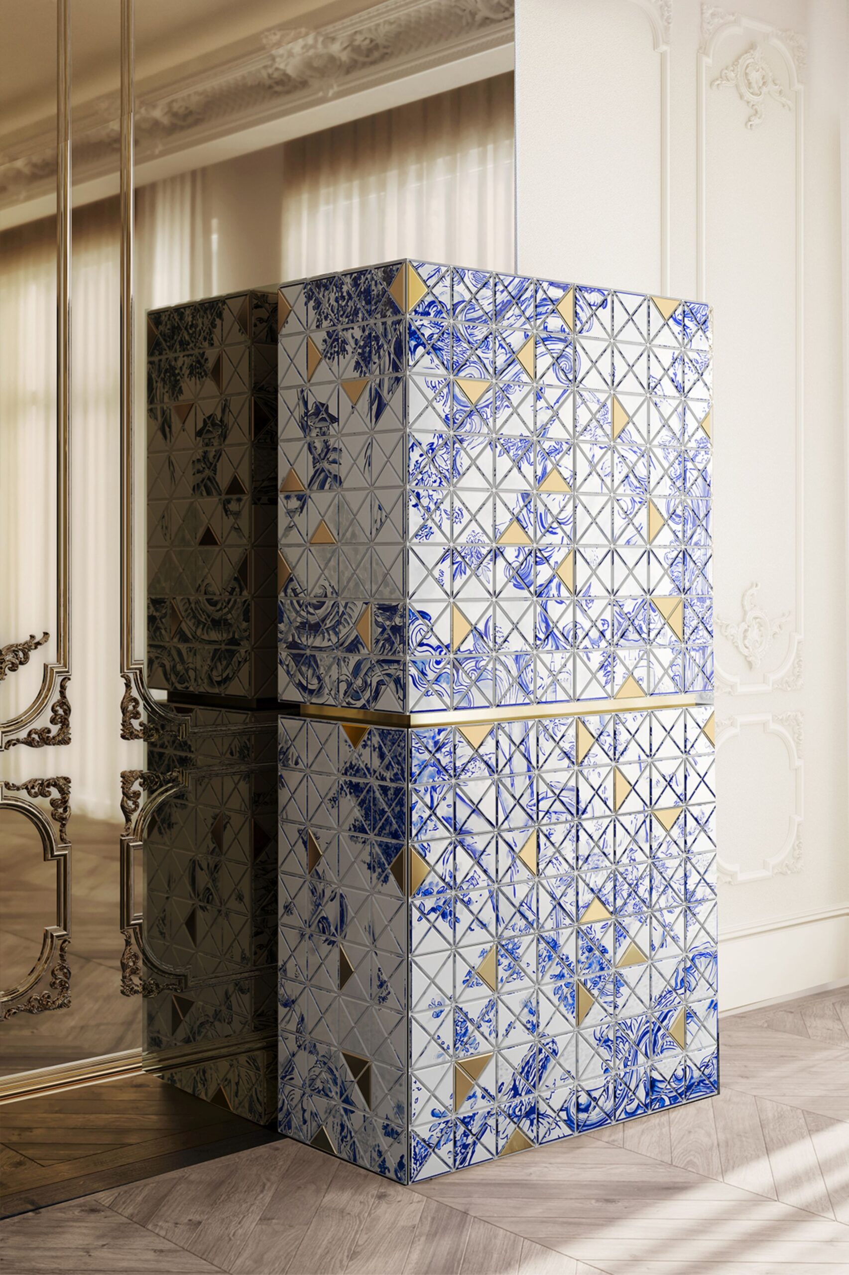 Handmade leaf gilding triangles, green shade triangles, and lacquering. Behind its two doors, a timeless combination of aged mirrors covers an open space containing nine interior drawers, each one with a golden exquisite knob. The doors are upholstered with diamond-quilted blue silk fabric.